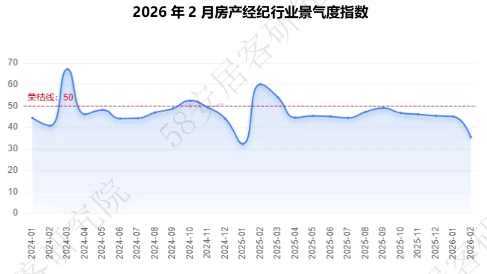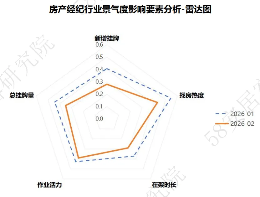 l行业景气度:2026年2月,房产经纪行业景气度显著下降,指数由1月的45.03滑落至35.47,创近三年同期最低,此次下行主要受春节假期影响,供需两端同步走弱,加上政策影响滞后,五大指标未能形成有效拉升。