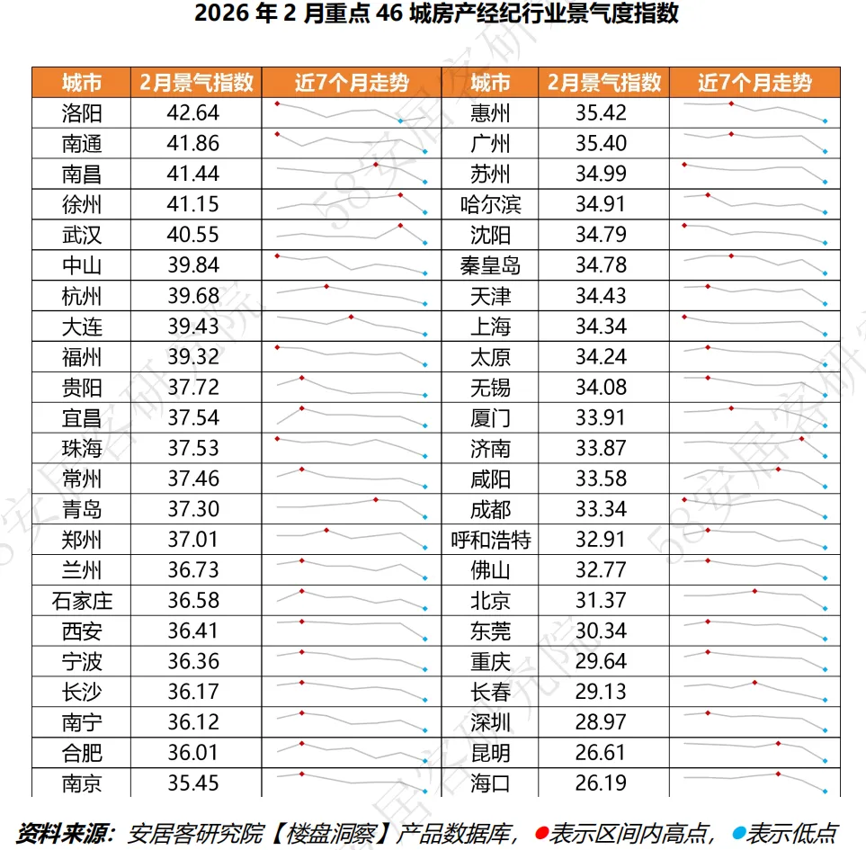 l46城表现:2026年2月,重点监测46城房产经纪景气度指数全面走弱,均低于50荣枯线,达到7个月以来最低值,环比平均回落10个百分点,同比平均回落25个百分点。