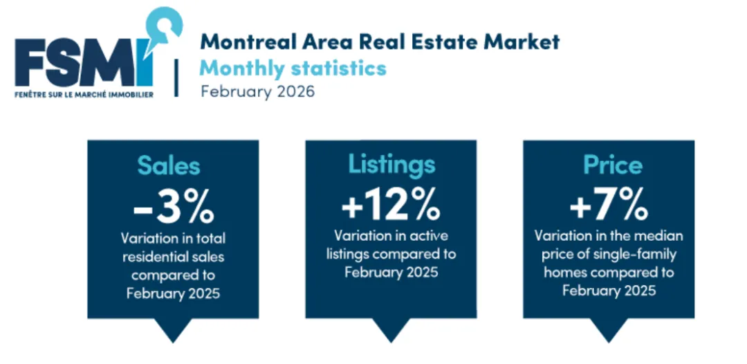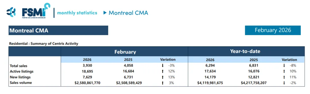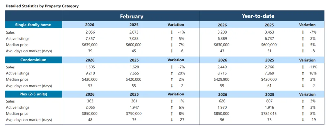 魁北克房地产经纪人专业协会QPAREB,3月5日发布最新住宅房地产统计报告。数据显示,2026年2月Montreal Census Metropolitan Area(大蒙特利尔地区,CMA)住宅市场成交量略有下降,但整体市场正在进入一个更加稳定、逐渐平衡的发展阶段。根据基于经纪人数据库Centris的统计,2026年2月蒙特利尔都会区共完成3,930宗住宅交易,比2025年同期下降3%。其中,plex是唯一实现销售增长的细分市场,显示投资型物业仍保持一定吸引力。从地理区域来看,蒙特利尔岛内(Island of Montreal)是唯一一个成交量保持稳定的区域。- Vaudreuils-Soulanges:下降6%