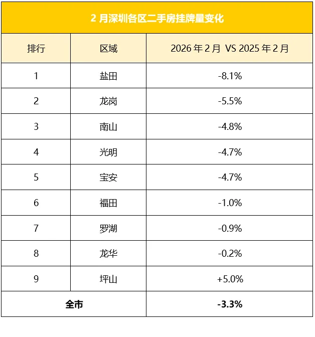 近期深圳二手房供需格局得到优化,市场信心修复信号愈发明确。据深圳贝壳研究院监测,今年2月,贝壳深圳合作门店二手房挂牌量较去年同期下降3.3%。
