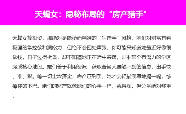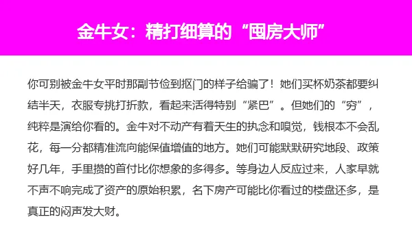 哎,说到月光族,你是不是马上想到那种工资一到手就没,整天喊穷的姐妹?那你可要看走眼了!现在有些人啊,表面上跟你一起吐槽房租贵、奶茶又涨价,背地里可能早就悄咪咪攒下好几套房子了。这就叫“隐形富婆”,低调得让你根本看不出来。今天咱就来扒一扒,星座圈里最擅长玩这出“装穷”大戏的几位高手,看看她们是怎么一边哭穷,一边把房产证攒得厚厚的。