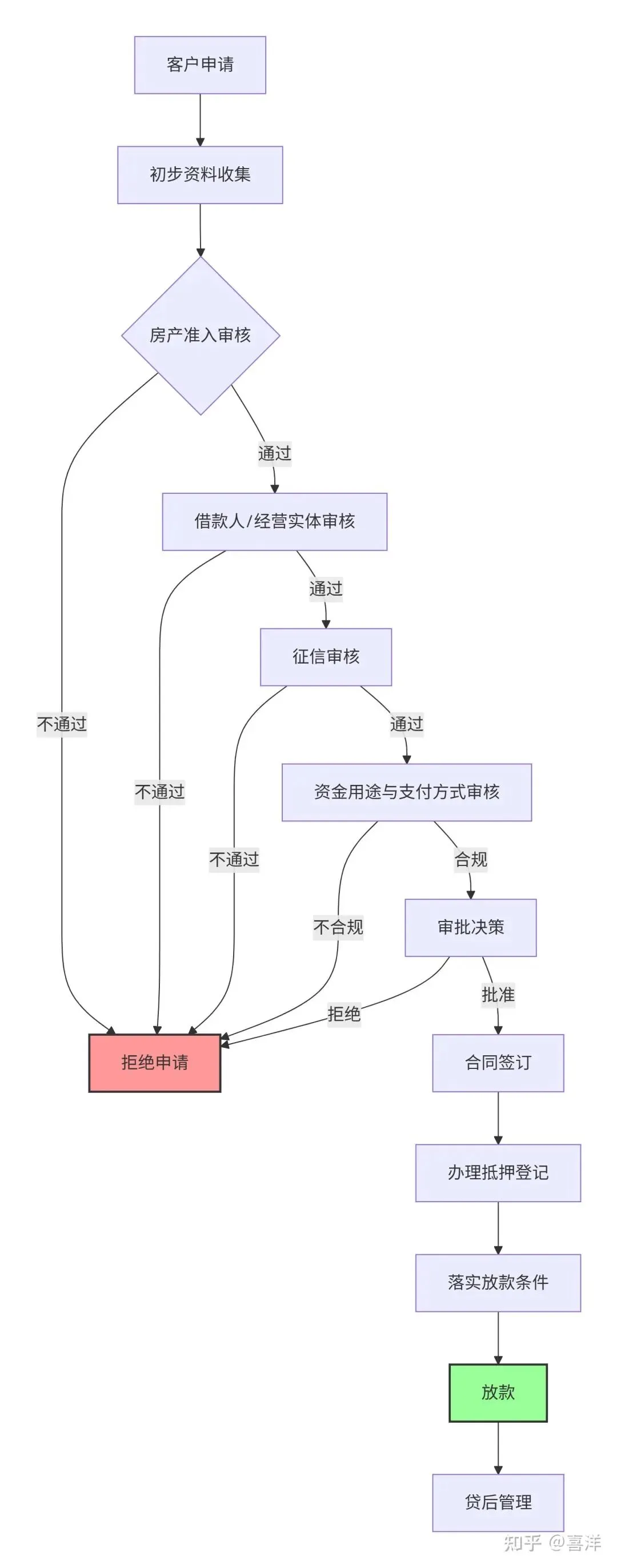 客户申请 → 2. 房产准入(分类、房龄、硬性门槛) → 3. 借款人/经营实体审核(注册时间、任职、禁入人员) → 4. 征信审核(逾期、查询次数) → 5. 资金用途与支付方式审核(合规性、收款方核验) → 6. 审批决策(批准/拒绝) → 7. 签合同 → 8. 办抵押 → 9. 落实放款条件 → 10. 放款 → 11. 贷后管理