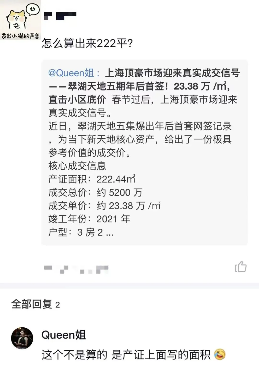 之前Queen姐写翠湖最新的成交情况,有朋友留言问到产证面积里写的222平是怎么得来的