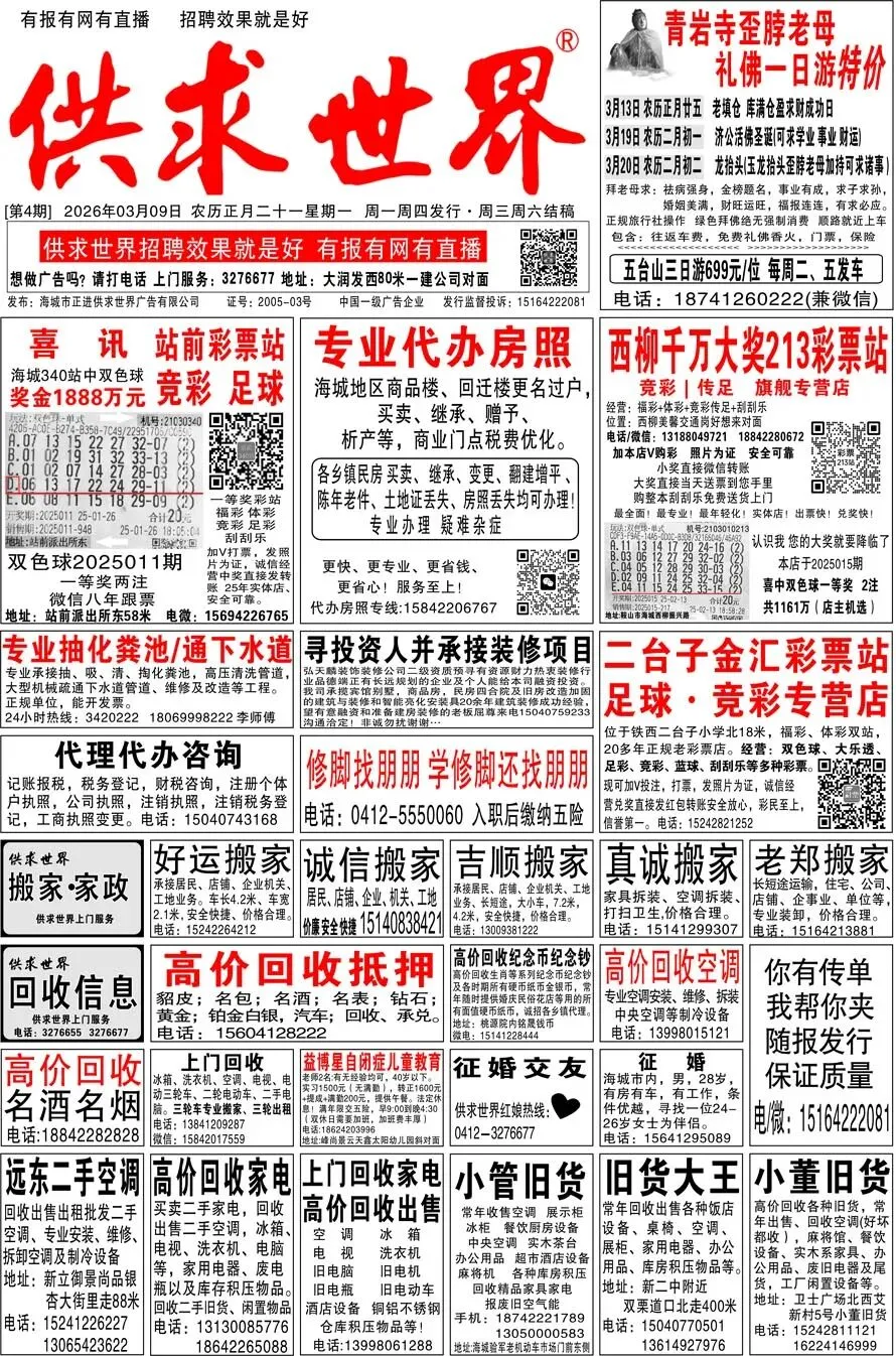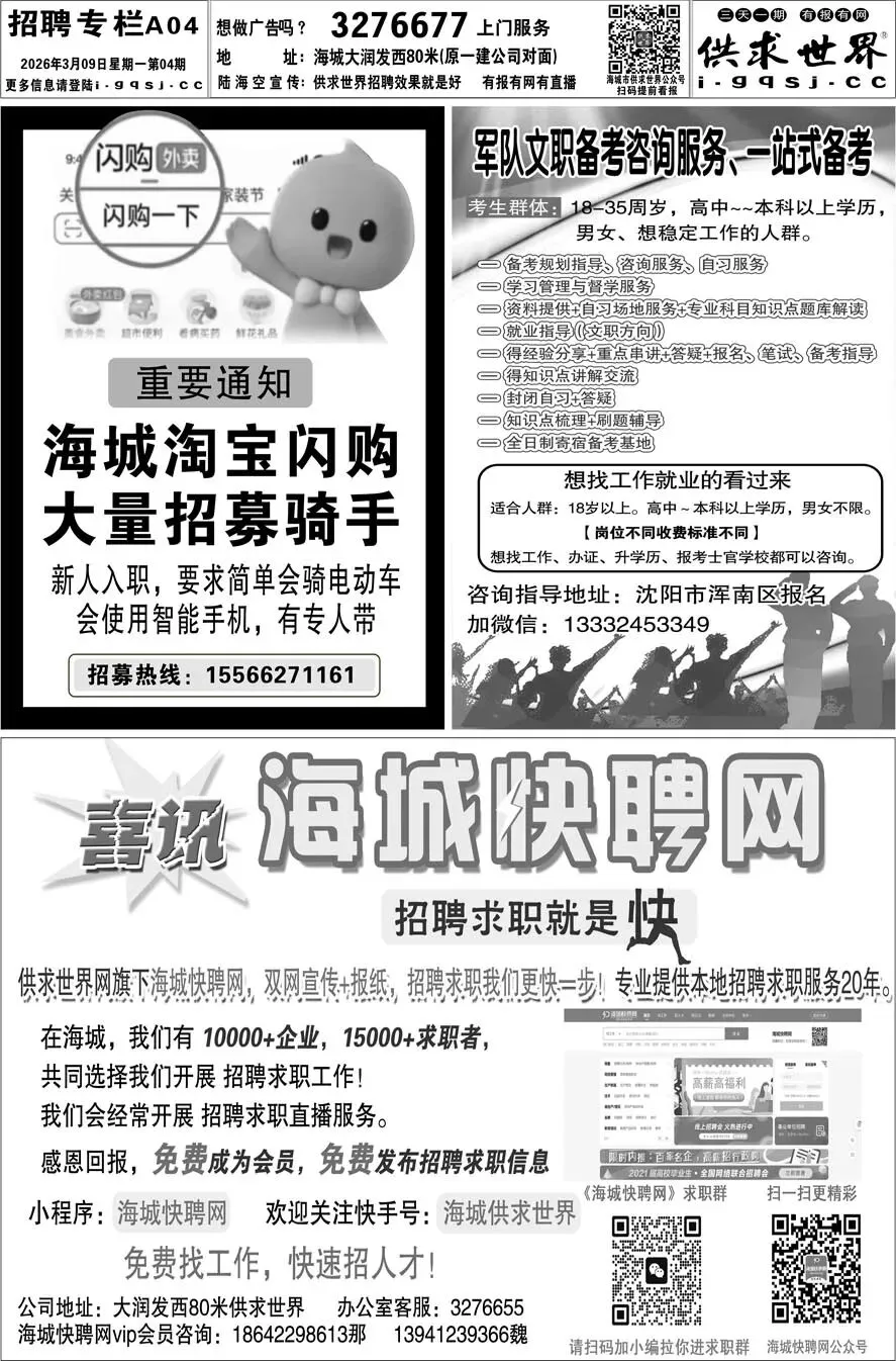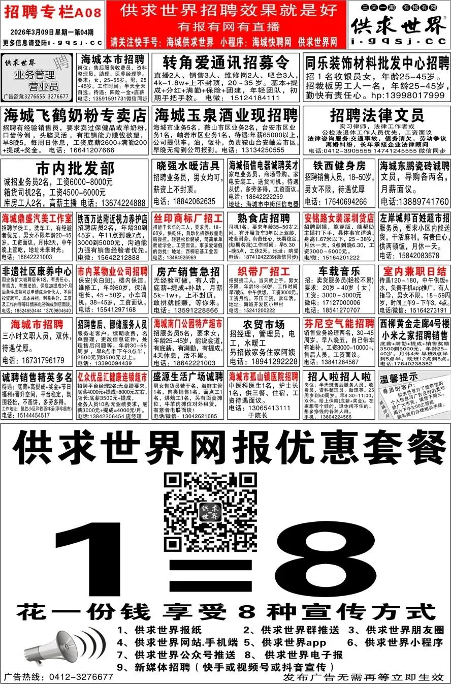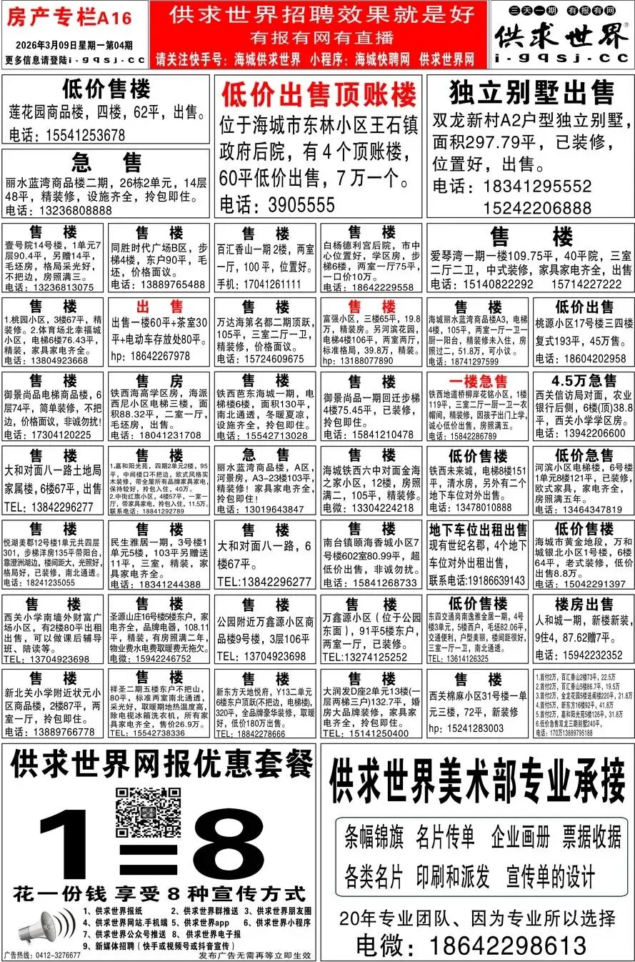 第4期《海城供求世界电子报》招聘房产等信息更新了,提前24小时抢先阅读(2026.3.9)