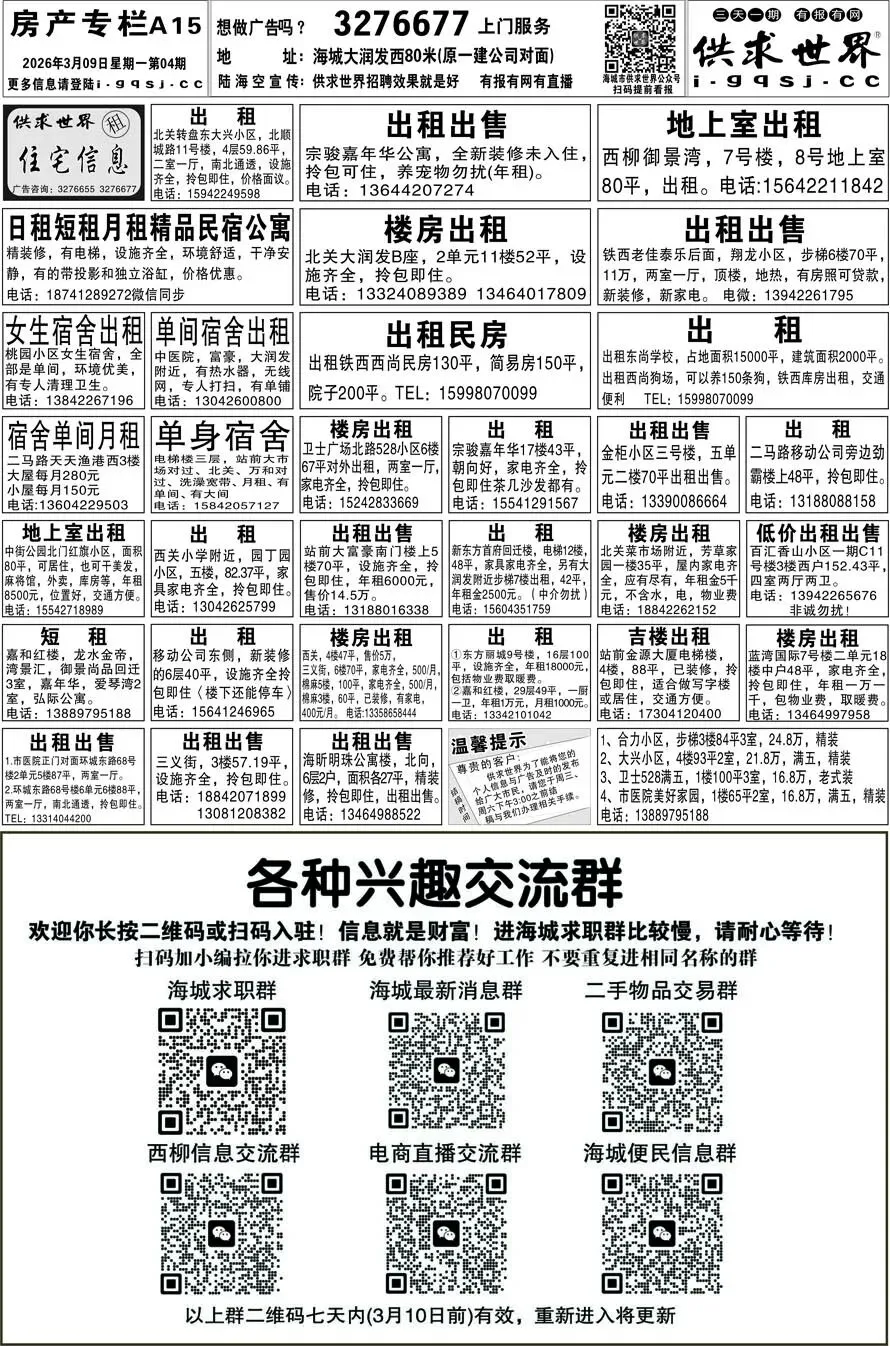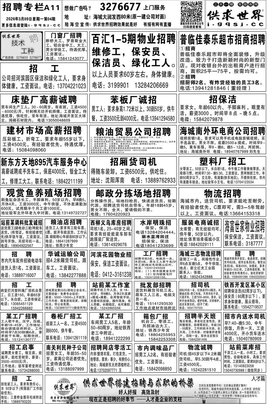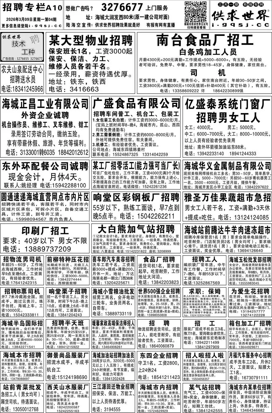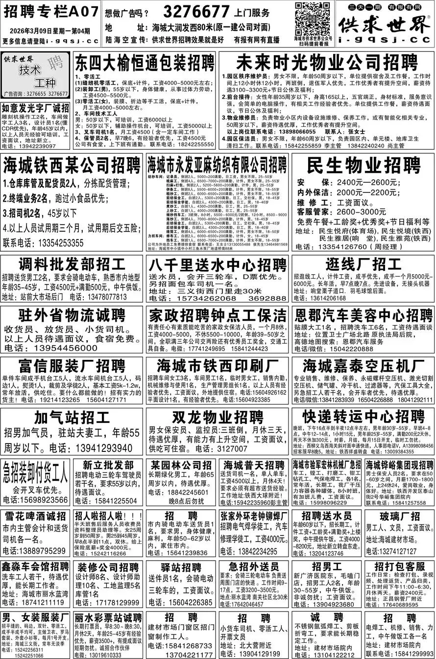 第4期《海城供求世界电子报》招聘房产等信息更新了,提前24小时抢先阅读(2026.3.9)