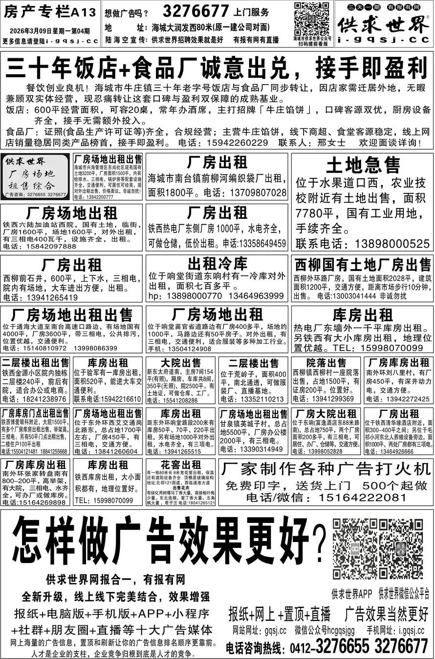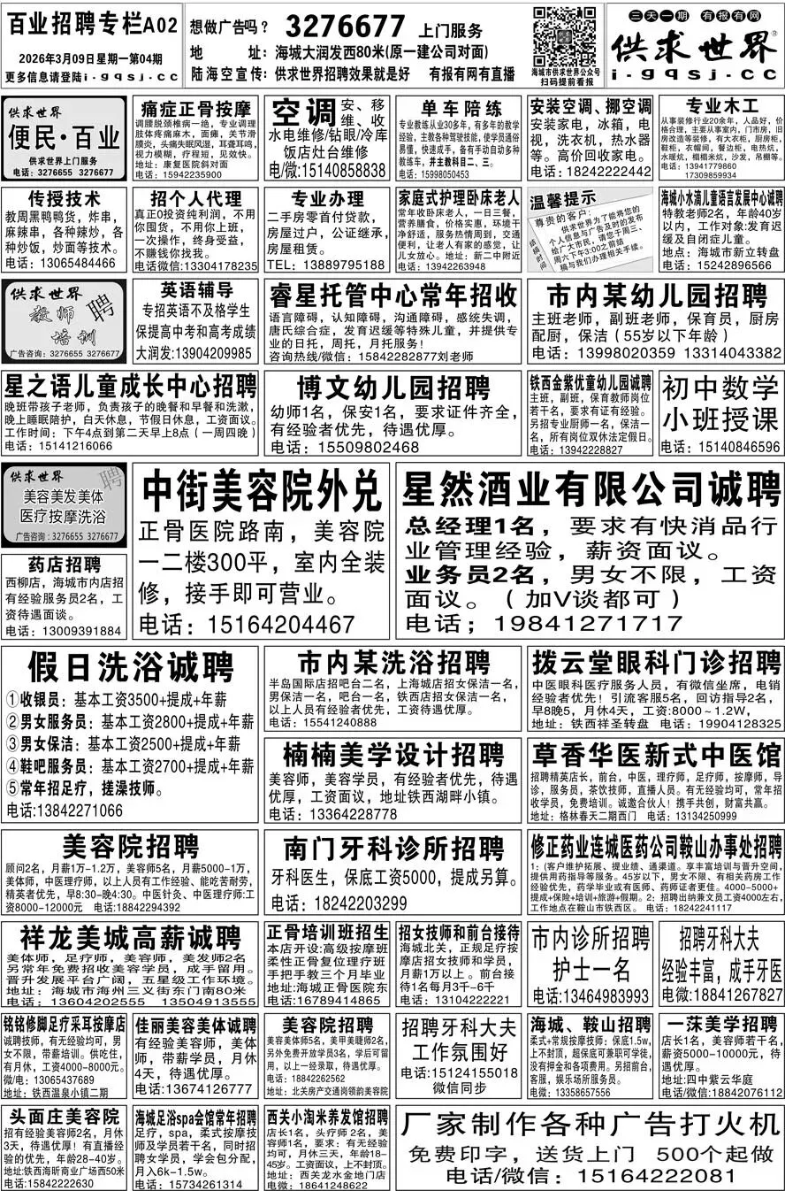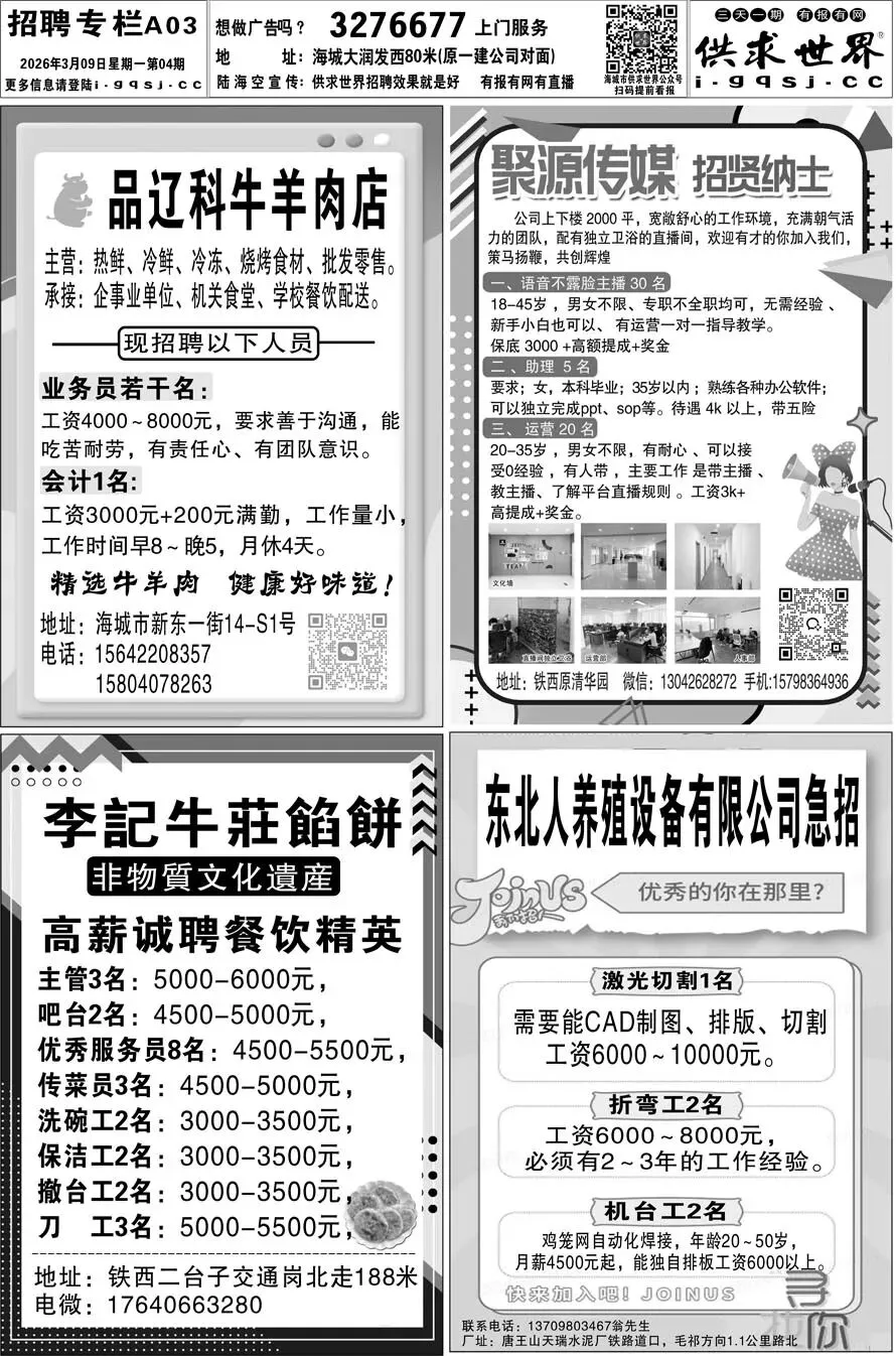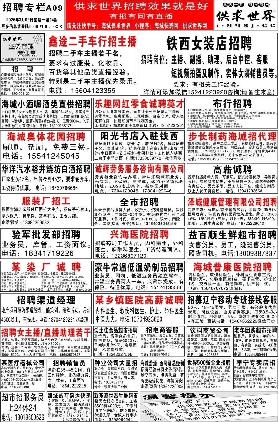第4期《海城供求世界电子报》招聘房产等信息更新了,提前24小时抢先阅读(2026.3.9)