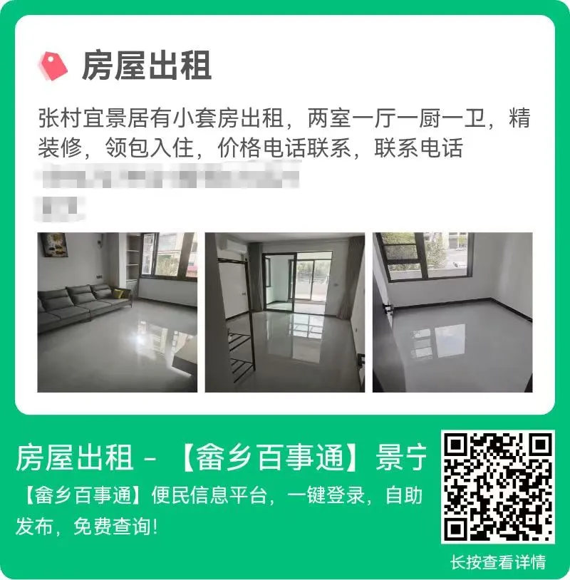 张村宜景居有小套房出租,两室一厅一厨一卫,精装修,拎包入住,价格电话联系。