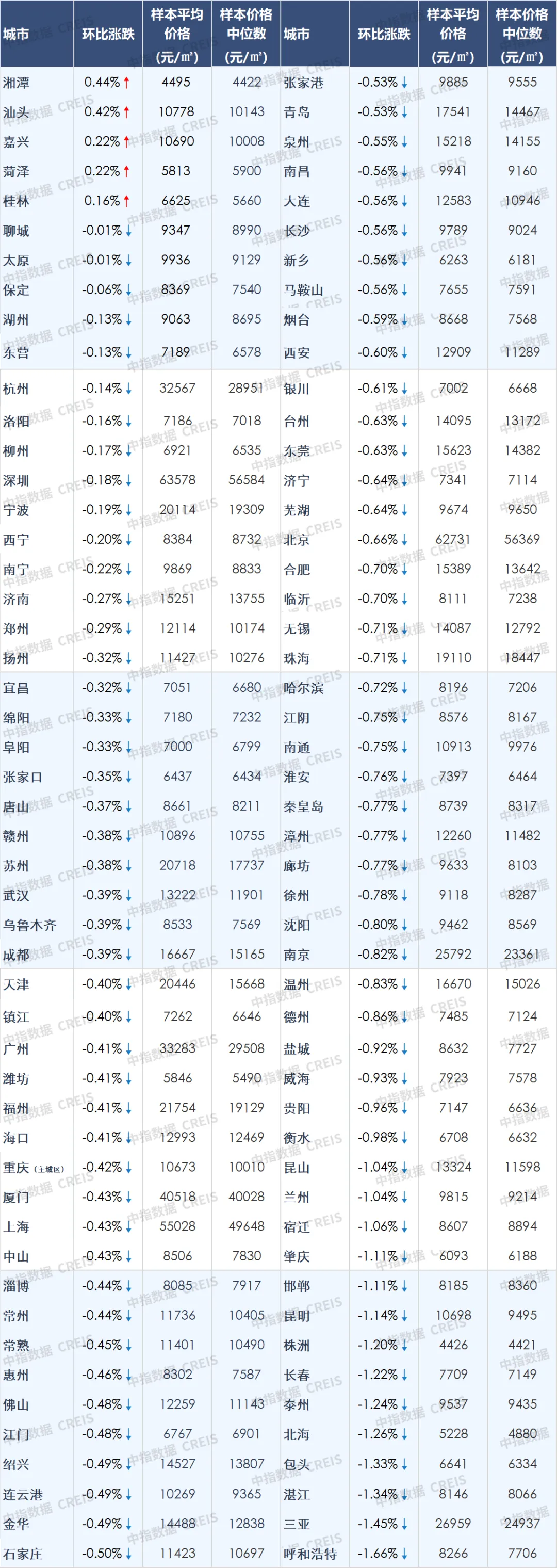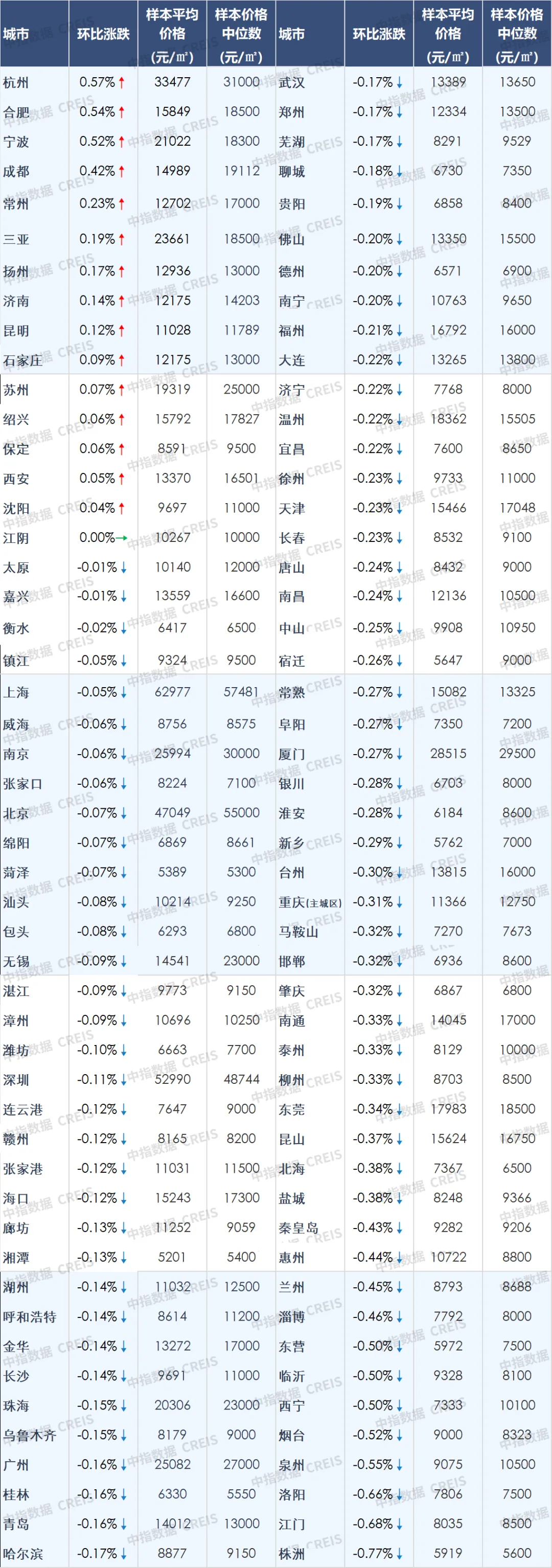 根据中国房地产指数系统百城价格指数对全国100个城市新建、二手住宅销售市场及50个城市租赁市场的调查数据: