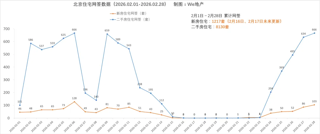 2026年2月,在2月16日和2月17日未公布数据的情况下,北京新房住宅网签1217套(期房715套+现房502套),网签面积152207.07㎡,套均面积约125.07㎡。