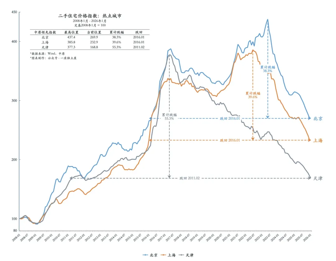 根据Wind公布的数据,北京二手房价格指数相比最高点的累计跌幅是38.3%,回到2016年1月的价格水准。