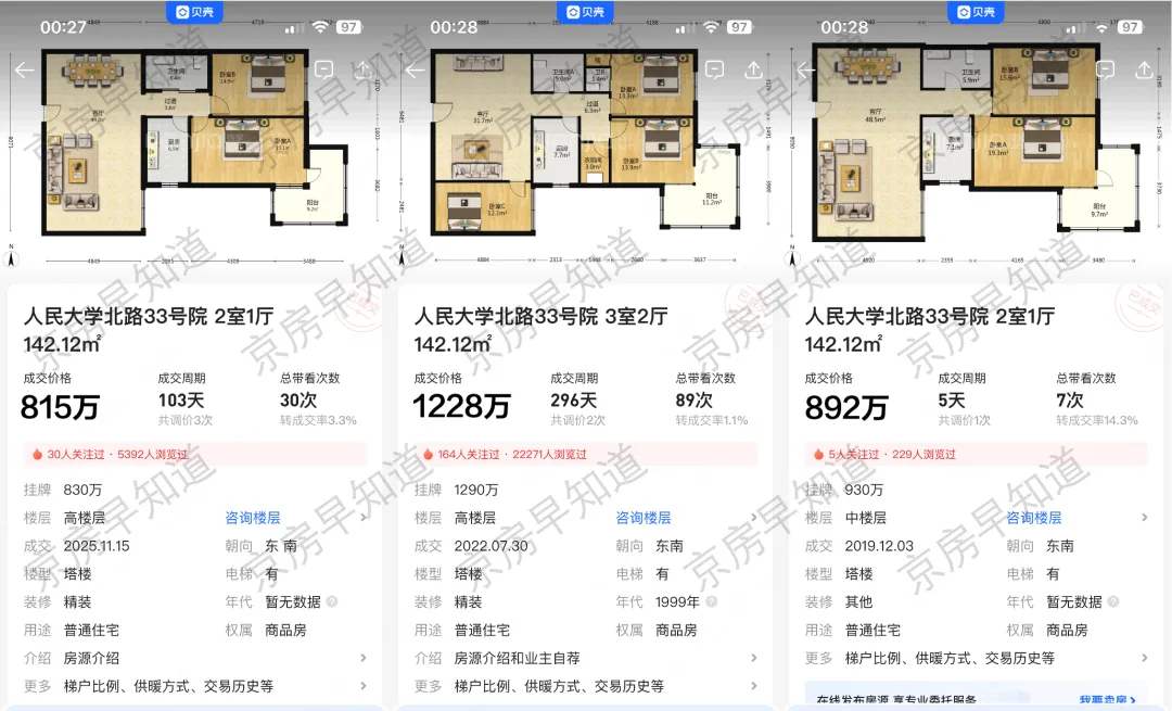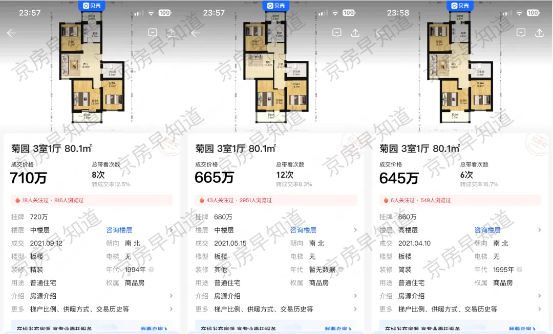 菊园在2026年1月成交了一套80㎡的3居室,成交价335万。同户型在2021年9月成交价是710万,降价了375万,幅度53%。
