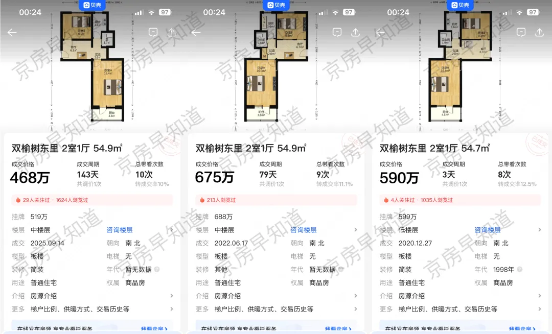 双榆树东里在2026年2月成交了一套54㎡的2居室,成交价388万。同户型在2022年6月成交价是675万,降价了287万,幅度43%。
