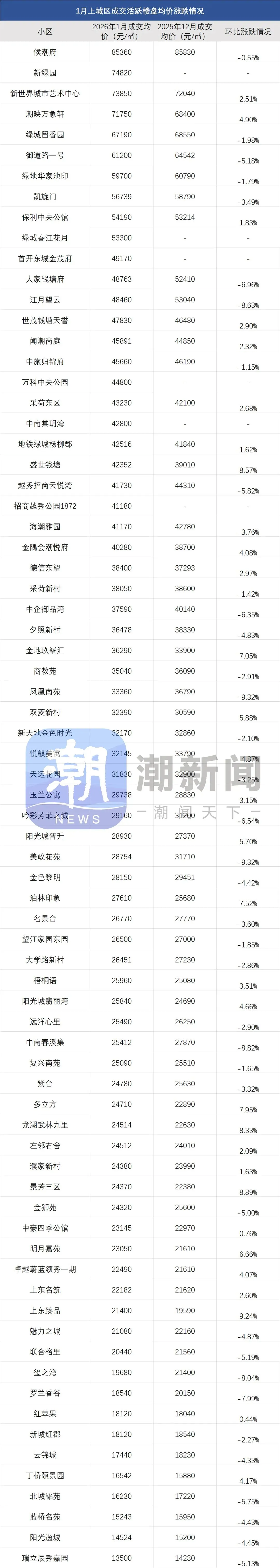注:一、以上数据来源于中指研究院,统计为2026年1月二手房成交均价,2025年12月二手房成交均价;二、在不同成交时期,成交的物业类型(别墅、排屋、公寓等)、精装与否、户型大小、楼层与楼幢位置的不同会造成价格变动;三、有些房源为了减少税费,会稍微压低成交单价;而有些二手房为了增加银行贷款,也有可能稍微做高单价,具体房源信息建议去实地看看。