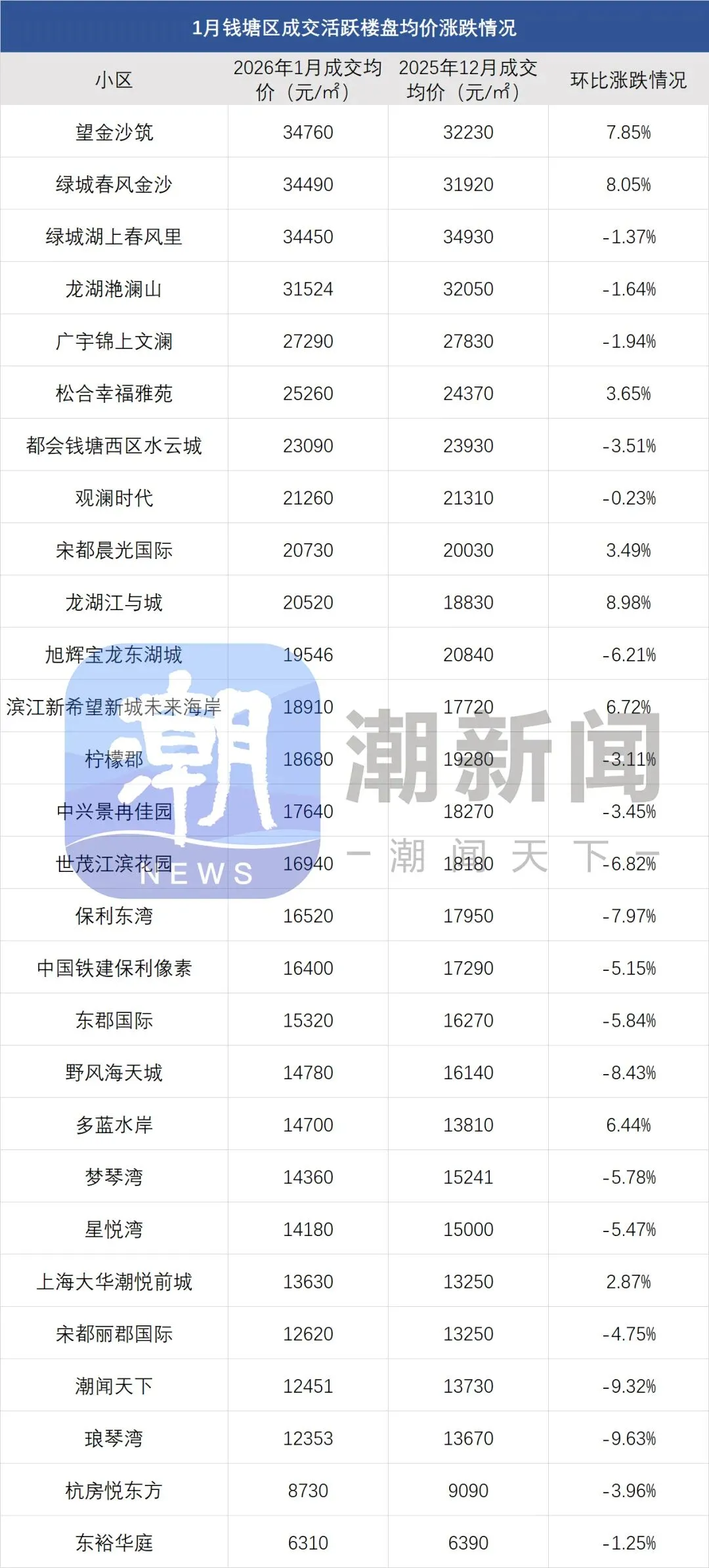 从潮新闻美好生活研究院统计的涨跌榜数据来看,市场分化在加速。同一板块内小区涨跌互现,学区房内部也是“冰火两重天”。例如钱江世纪城板块内,金色江南1月成交均价环比跌了9.14%,而亚奥城环比上涨了7.71%;价格下调后的文鼎苑成交热度回归,而文教板块部分第一梯队学区房成交量低迷,价格还在下跌。