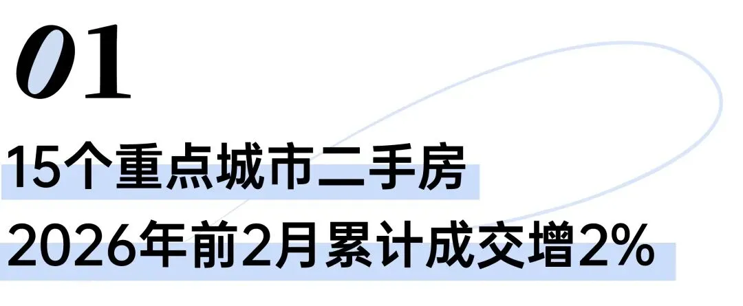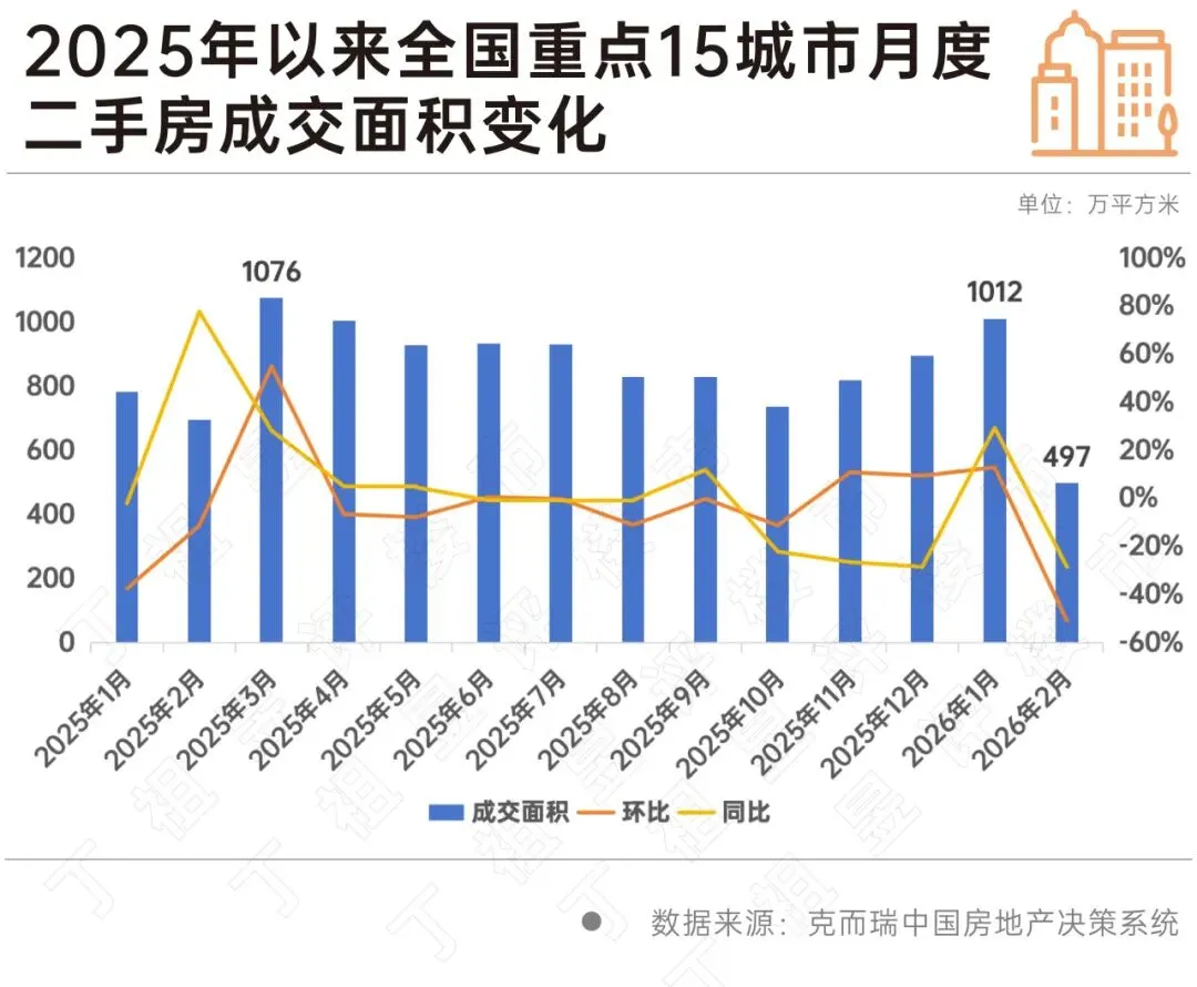 克而瑞监测数据显示,2026年2月,全国重点15城市二手房成交面积约497万平方米,1-2月累计成交面积约1509万平方米,同比微增2%。