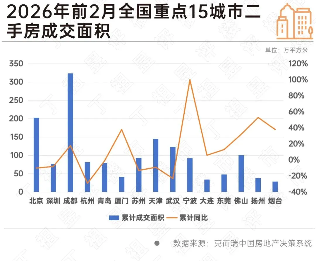 从重点城市成交面积绝对规模看,2026年前2月成都二手房成交面积达323.6万平方米,高居首位,累计同比增18%。