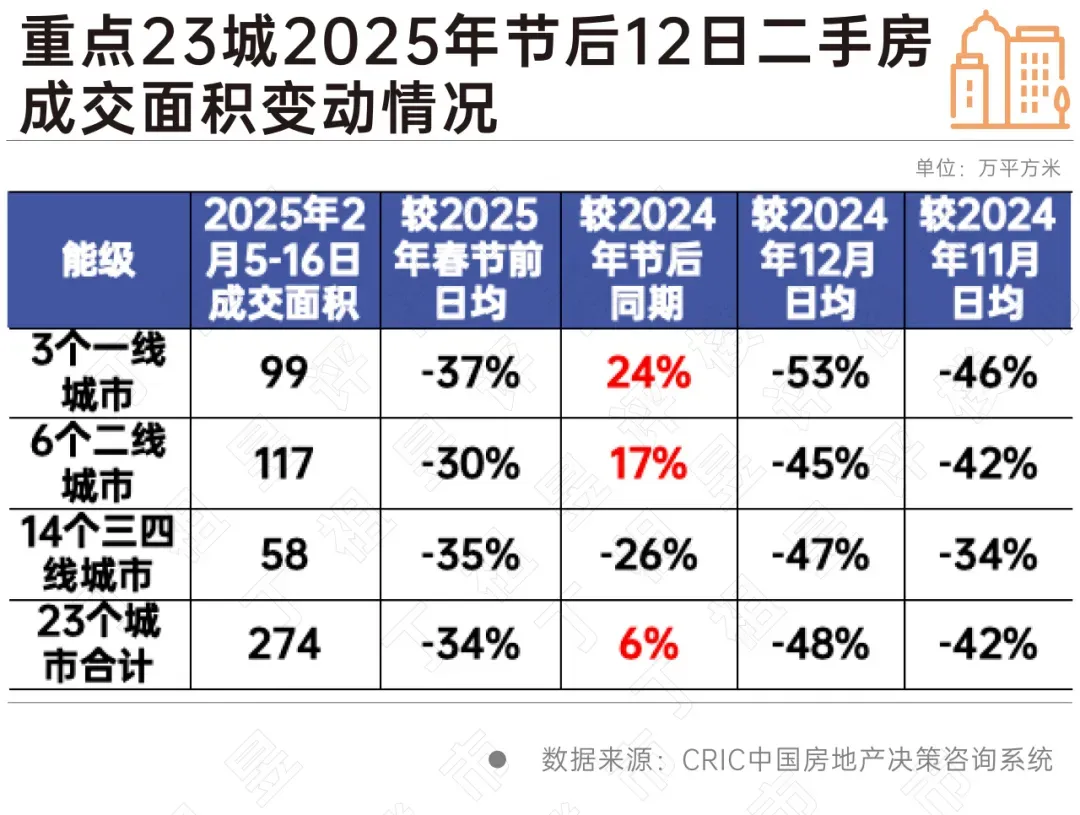 克而瑞监测数据显示,2025年2月5日至16日,重点23城二手房总成交规模达到了274万平方米,较2025年春节前日均下降34%,较2024年同期增长6%。