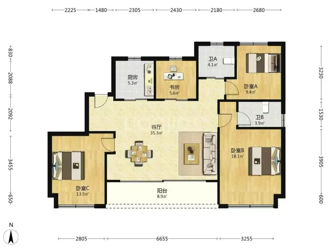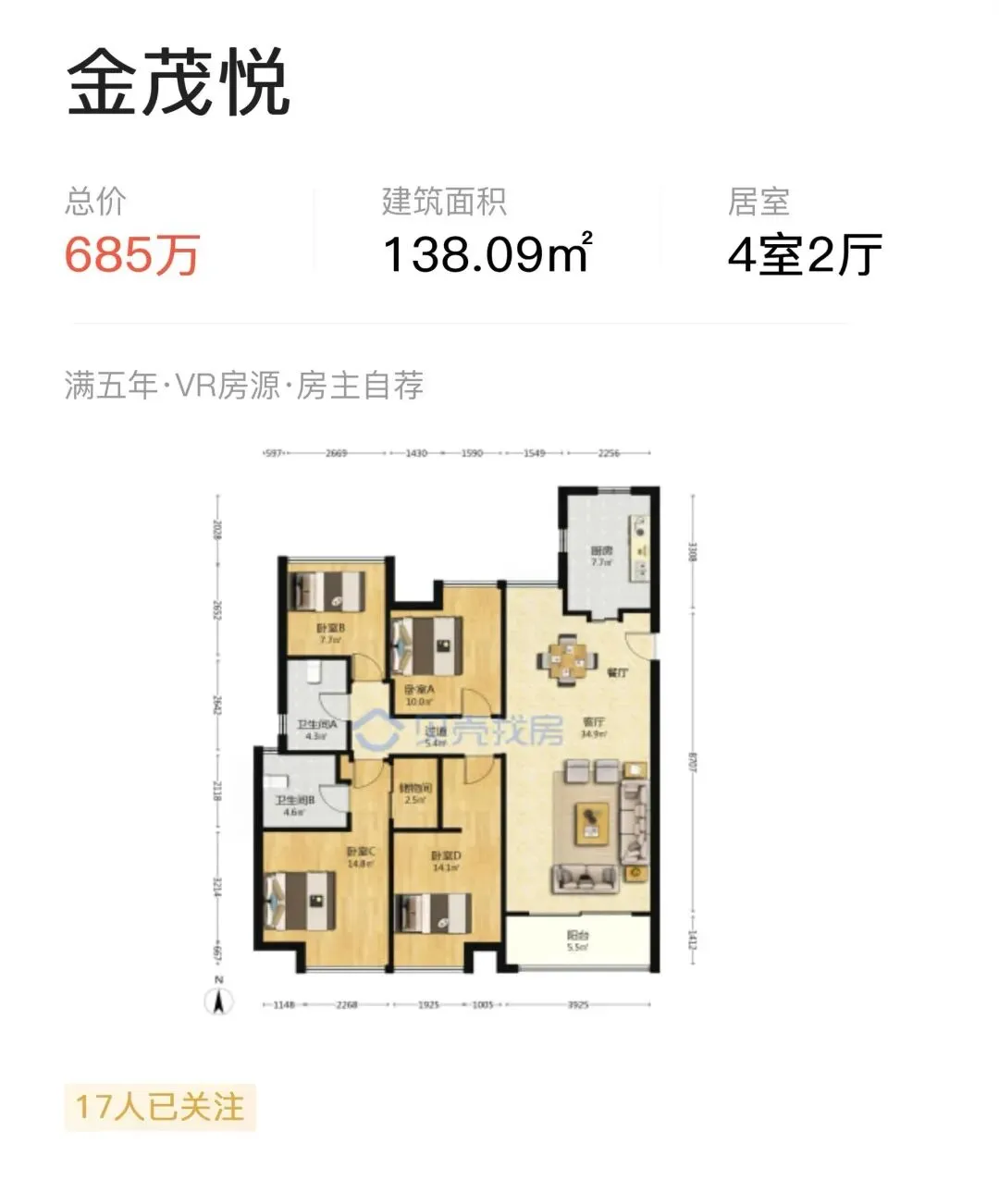 面积143平,4房2卫户型,总价730万带车位,送20万软装。