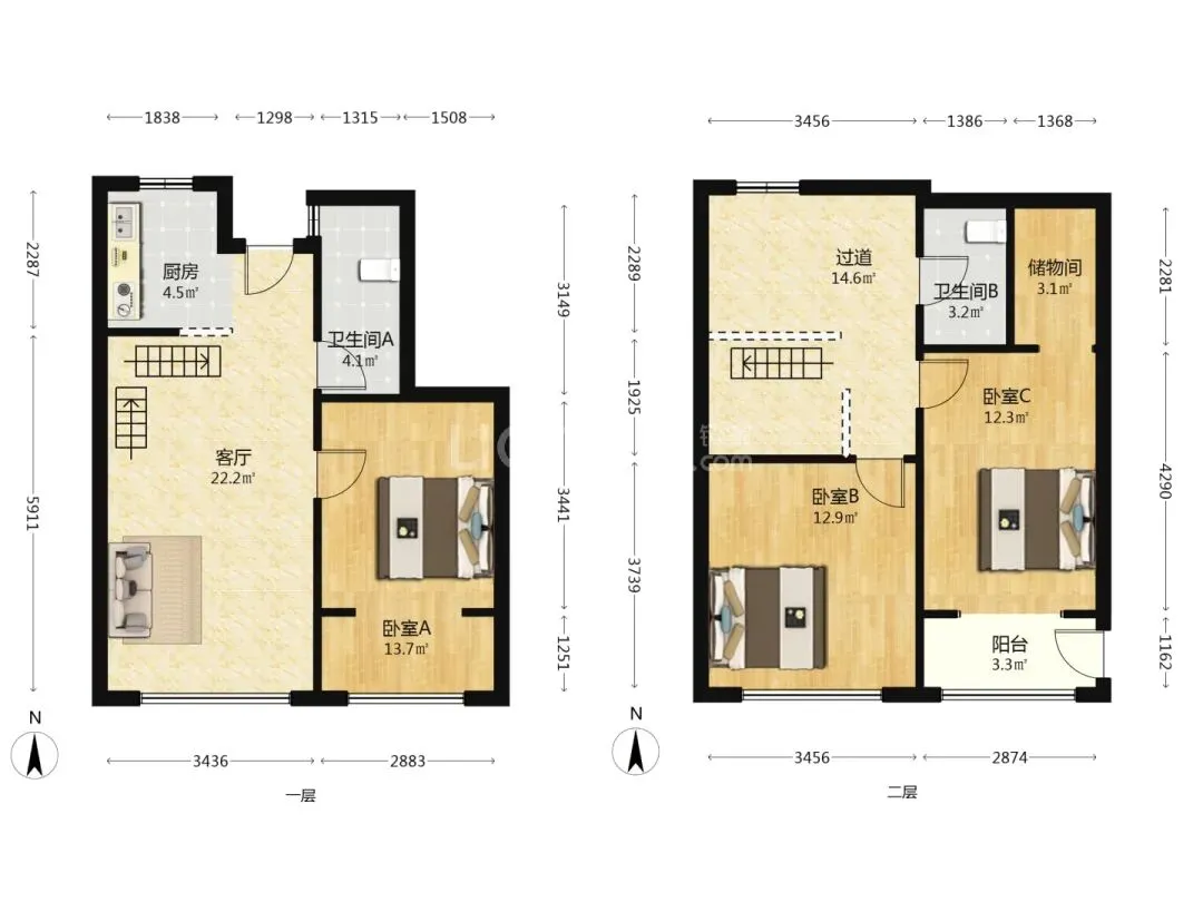 顶楼跃层,面积93平,3房2卫,带30平露台