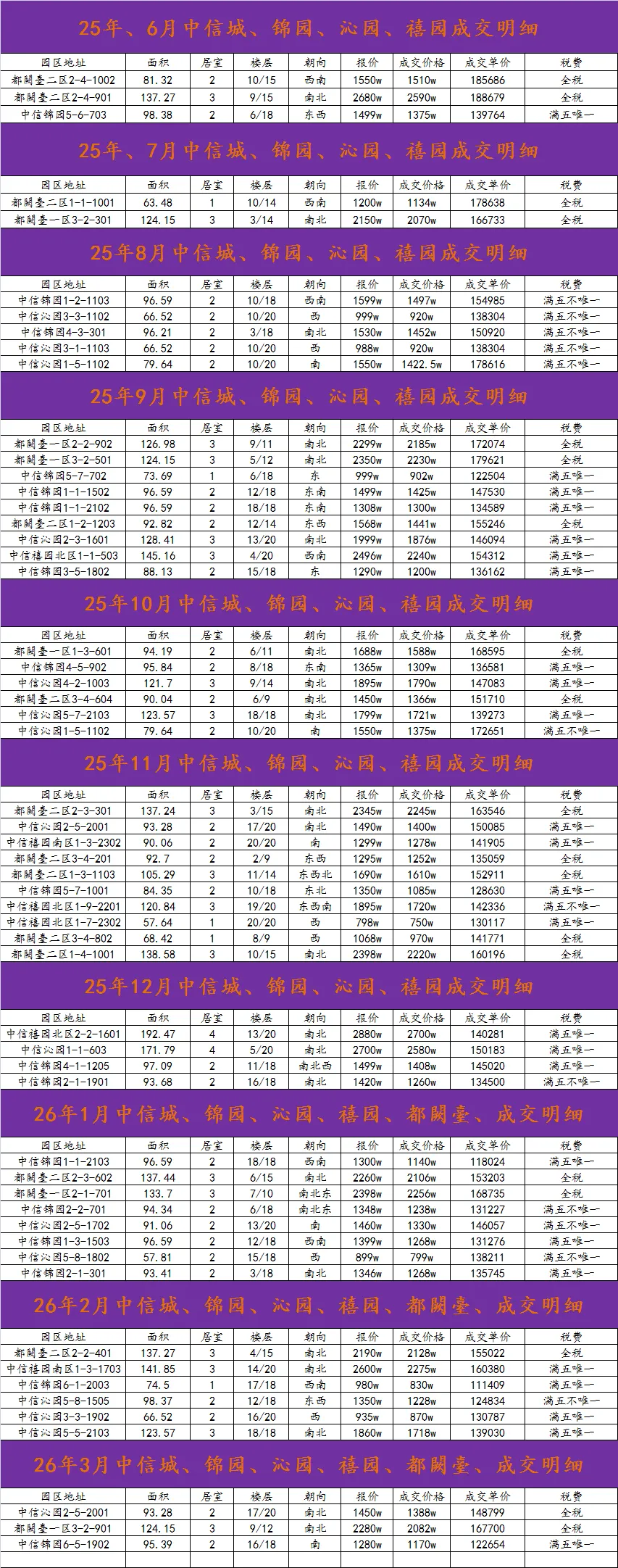 截止26.3.8中信城二手房成交数据参考
