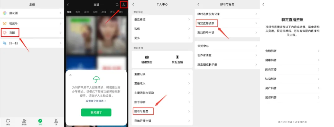 - 路径:【直播】→ 右上角「个人中心」(或“…”图标)→ 【账号与服务】→ 【特定直播资质】。