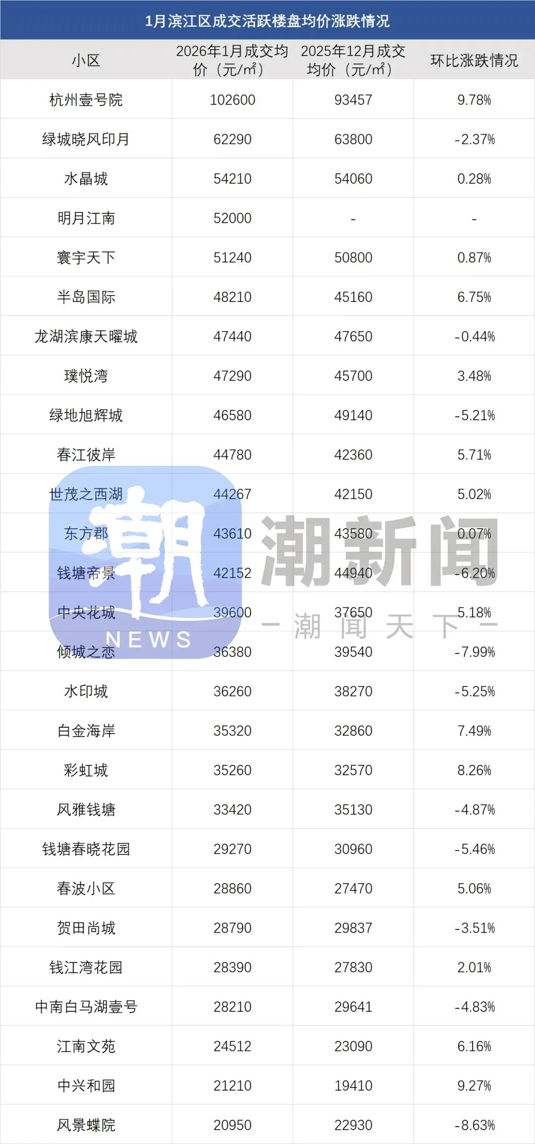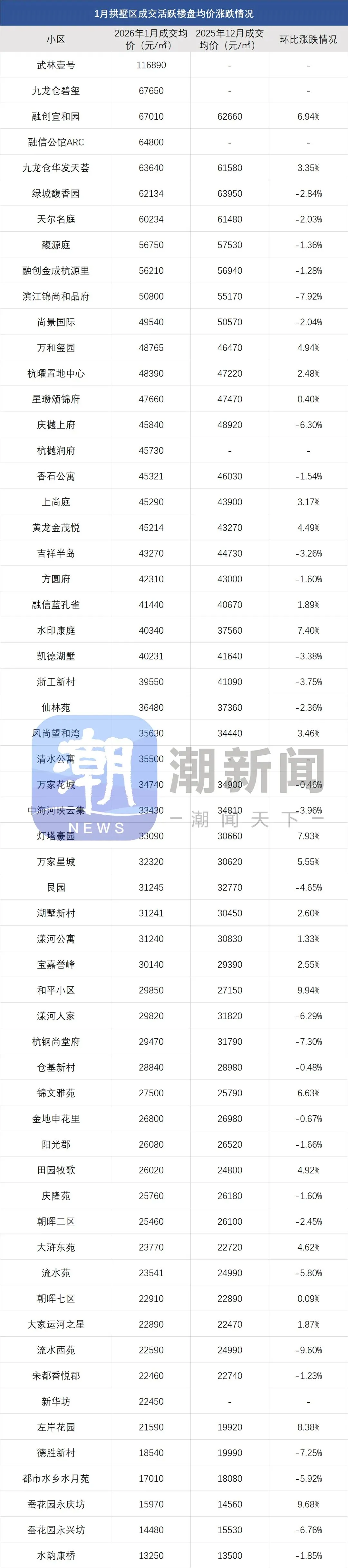 注:一、以上数据来源于中指研究院,统计为2026年1月二手房成交均价,2025年12月二手房成交均价;二、在不同成交时期,成交的物业类型(别墅、排屋、公寓等)、精装与否、户型大小、楼层与楼幢位置的不同会造成价格变动;三、有些房源为了减少税费,会稍微压低成交单价;而有些二手房为了增加银行贷款,也有可能稍微做高单价,具体房源信息建议去实地看看。