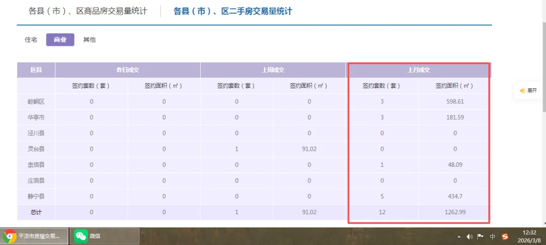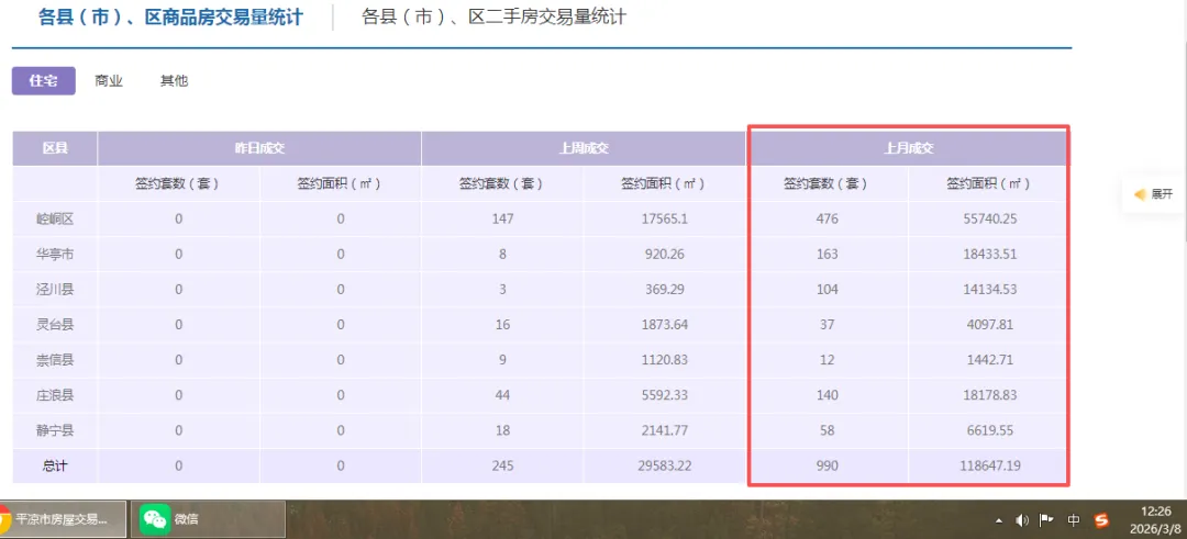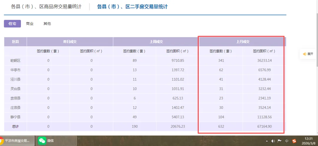 1.房子交易数量:崆峒区、华亭、泾川、灵台、崇信、庄浪、静宁住宅交易量分别是476、163、104、37、12、140、58套,