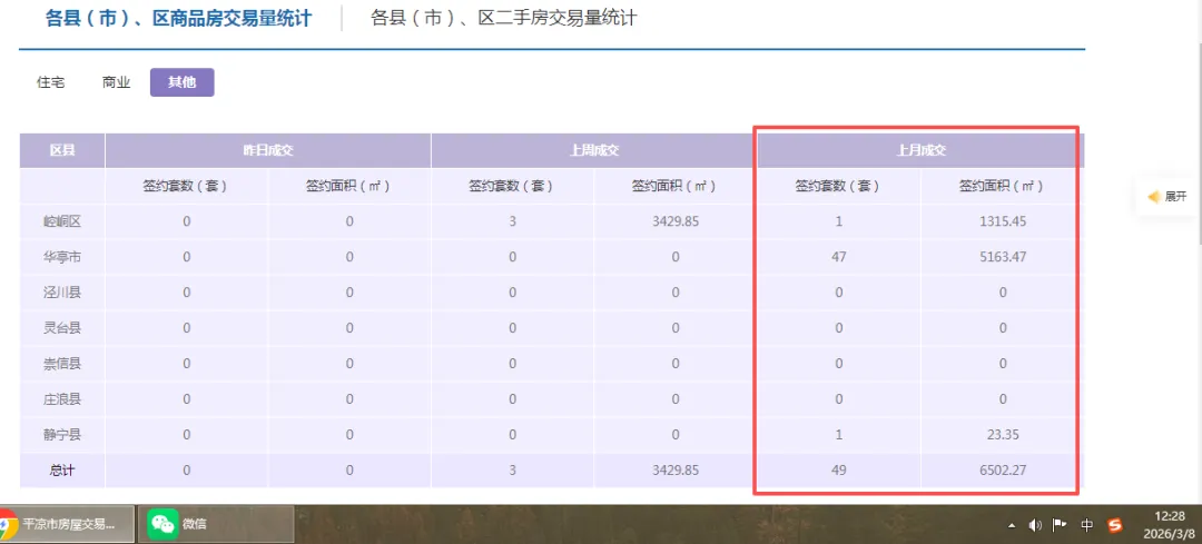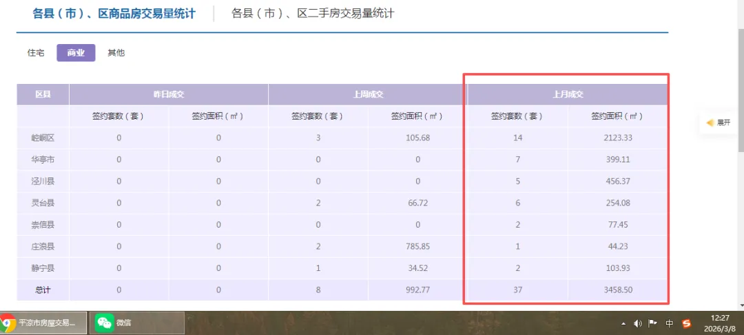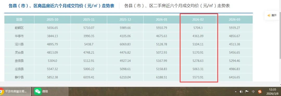 崆峒区、华亭、泾川、灵台、崇信、庄浪、静宁商品房交易价格分别是5704.3、