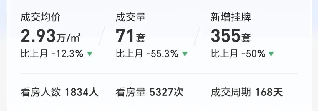 (1)本月二手房成交均价2.93万/平,环比下降约12.3%;(注:成交均价——即统计日内,二手普通住宅的成交总价/成交总面积。)