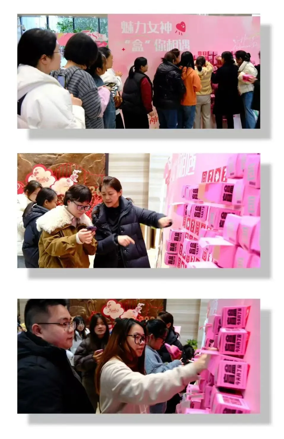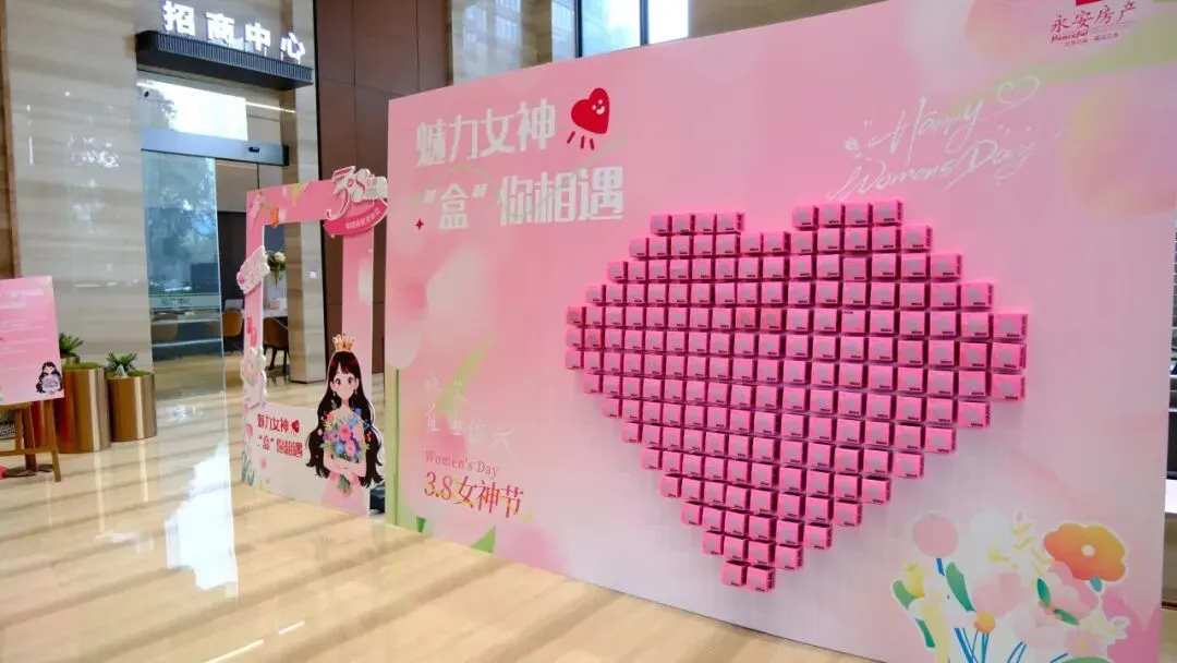 金箔贴画手作沙龙场地暖意融融,永安大厦大堂同样惊喜不断。“魅力女神,‘盒’你相遇”盲盒抽取活动热闹开启,爱心墙上的盲盒藏着不期而遇的小美好,为节日增添了更多欢乐与期待。