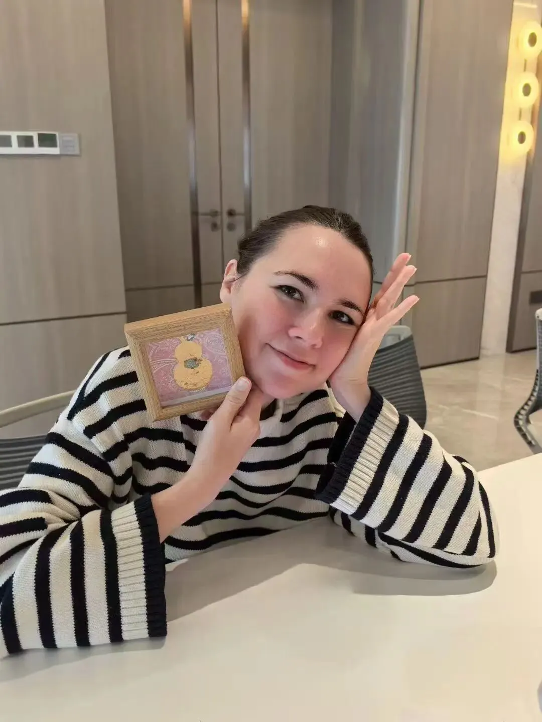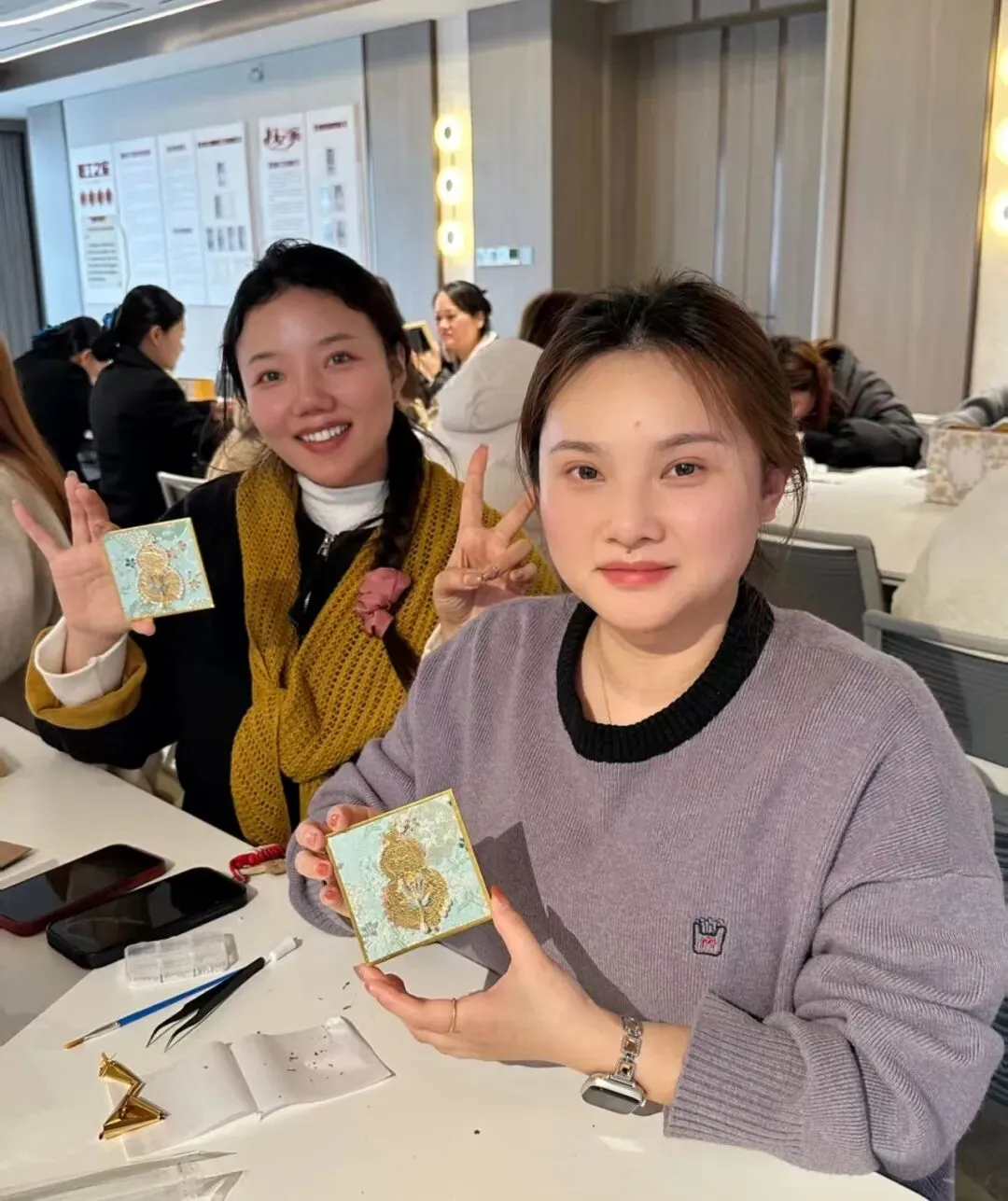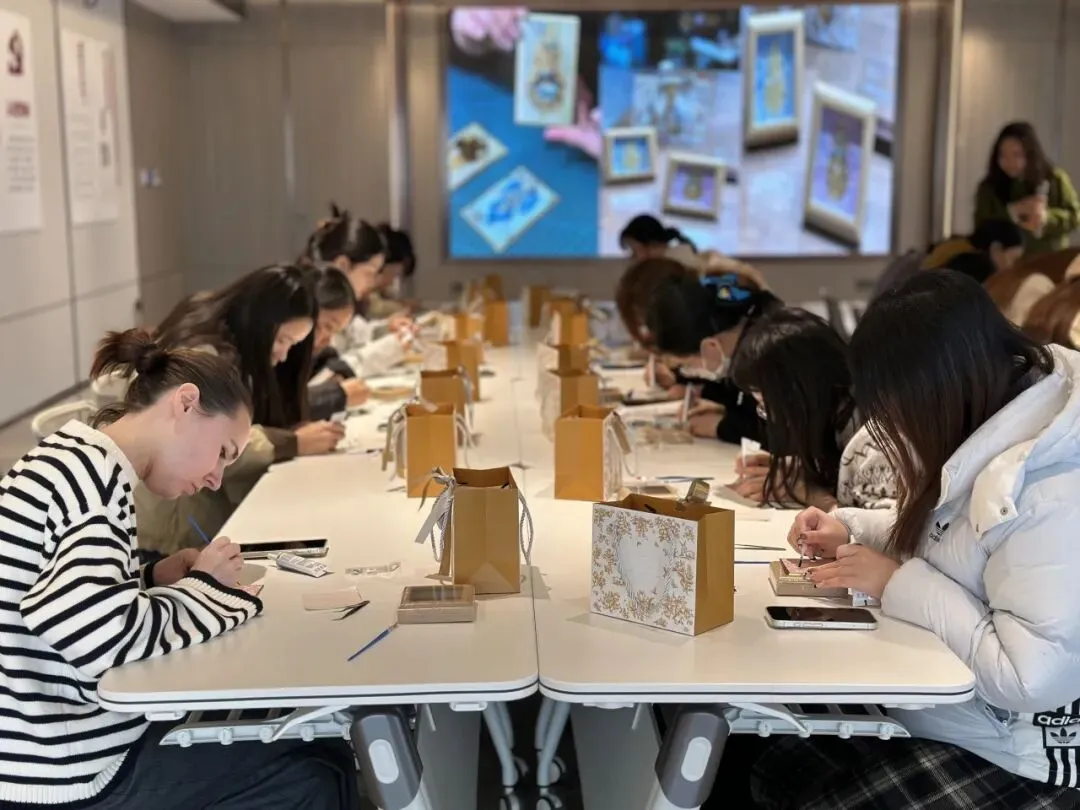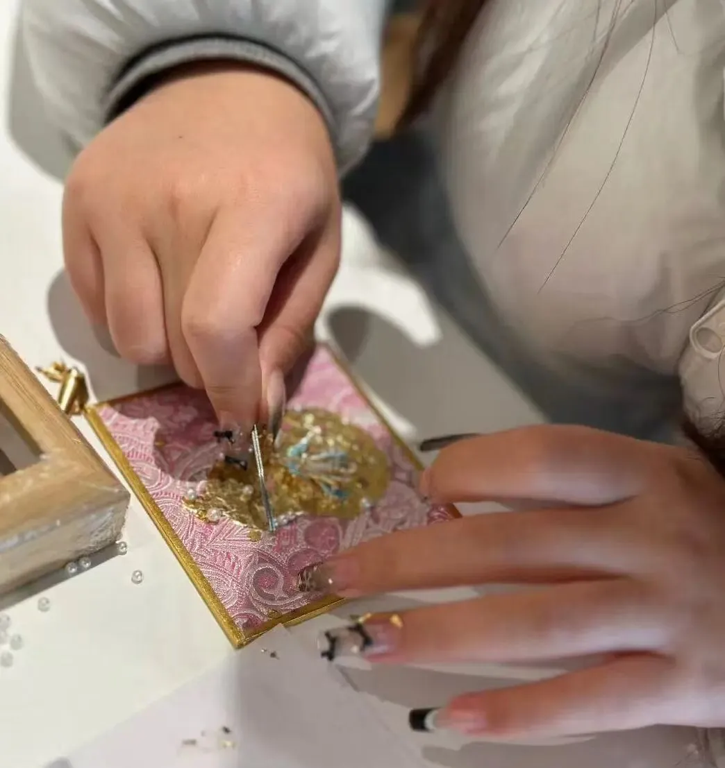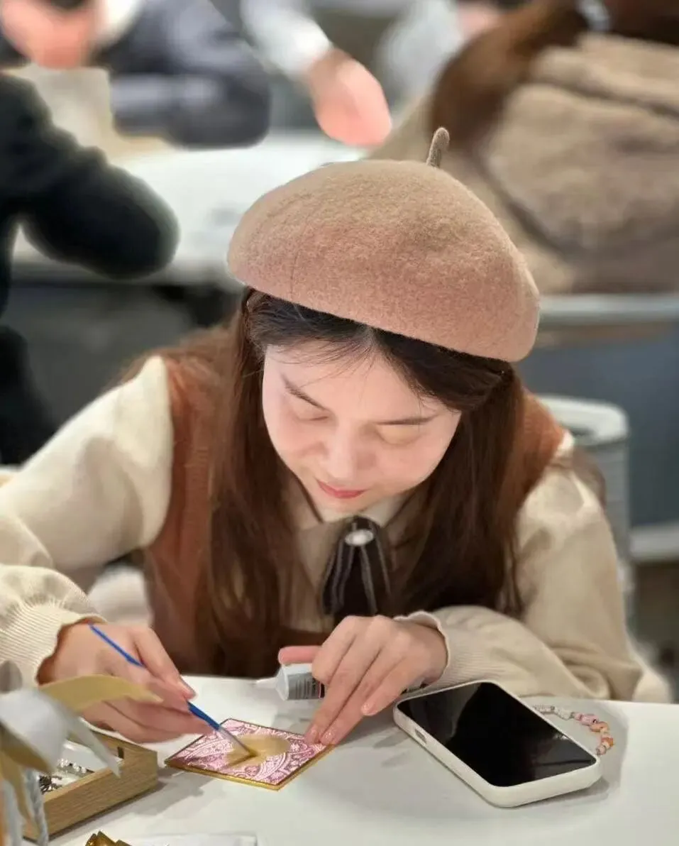在老师的指导下,女神们化身巧手匠人,兴致勃勃地挑选珍珠等精致配饰,再搭配灵动的金箔,小心翼翼地铺展、粘贴、修饰,彼此间还不时交流创意,欢声笑语伴着指尖的细致创作,将款款巧思与心意尽数融入作品之中。
