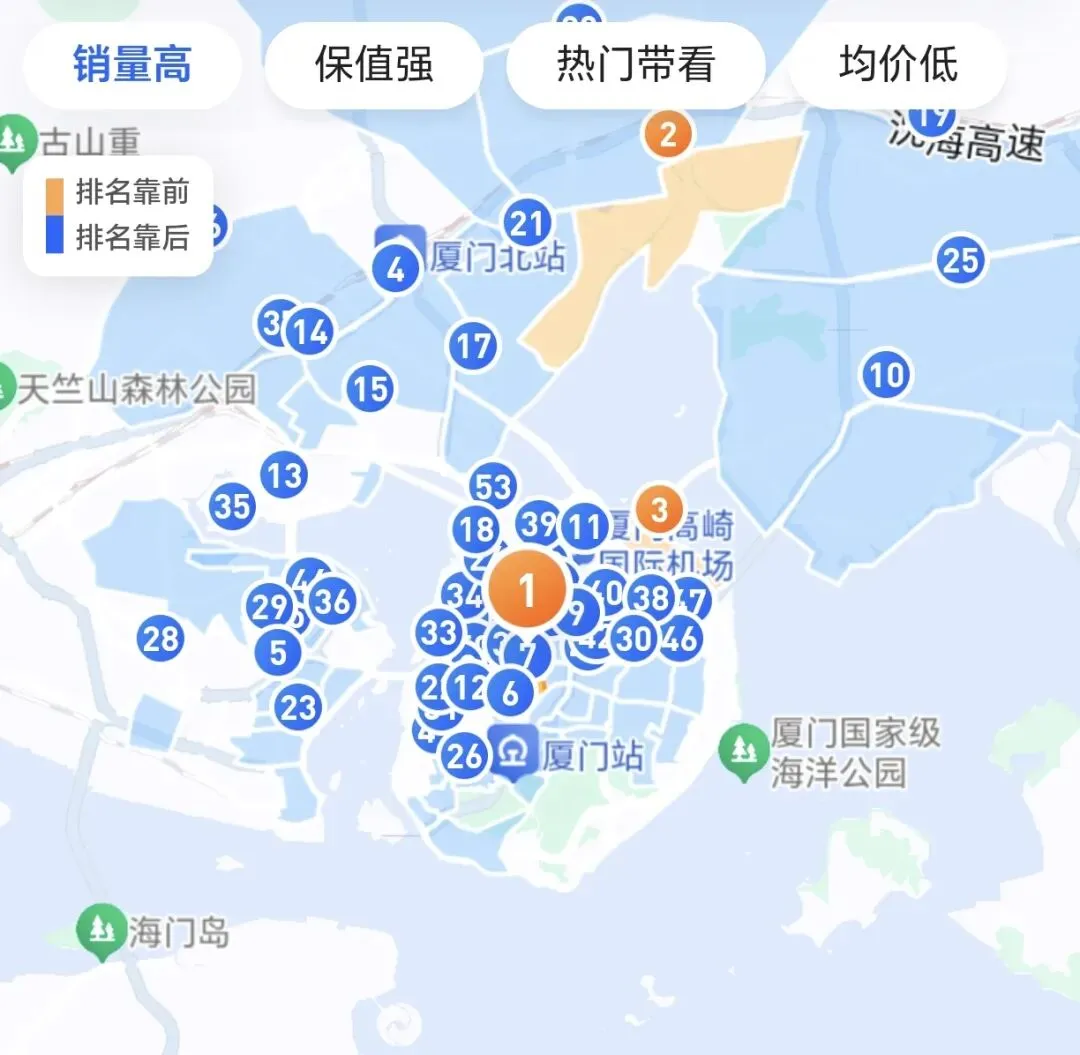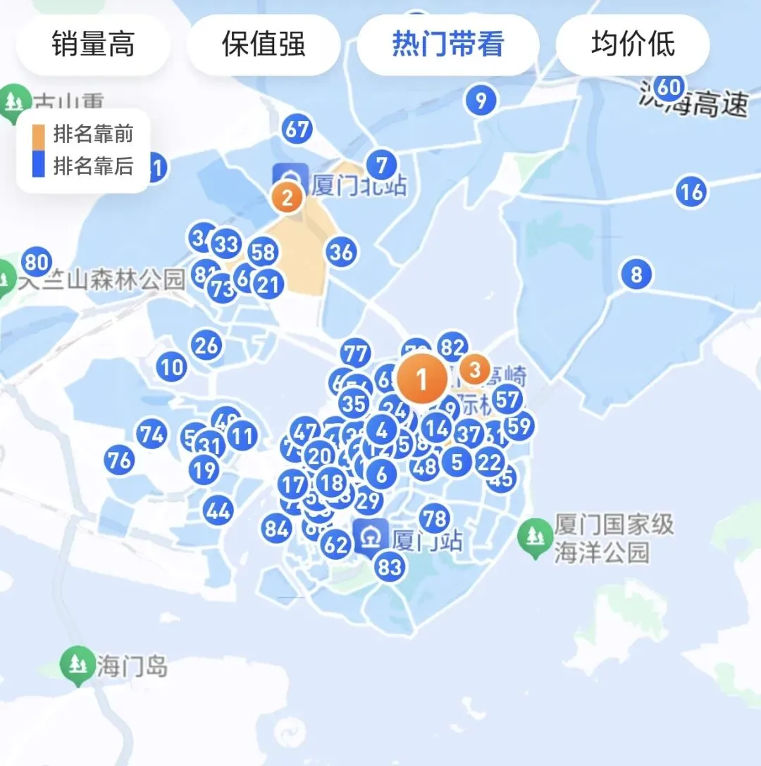 (2)厦门“近7日热门带看”前三版块分别是:第一,枋湖(190人);第二,集美新城(179人);第三,五缘湾(174人)。