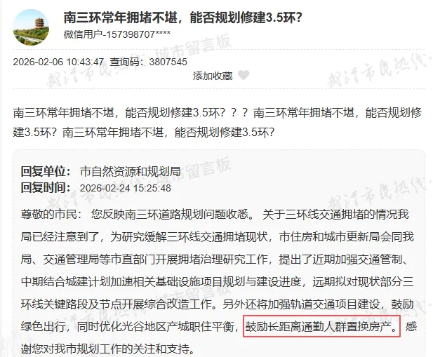 网友希望能通过修建3.5环缓解南三环的拥堵,武汉市自然资源和规划局回复: