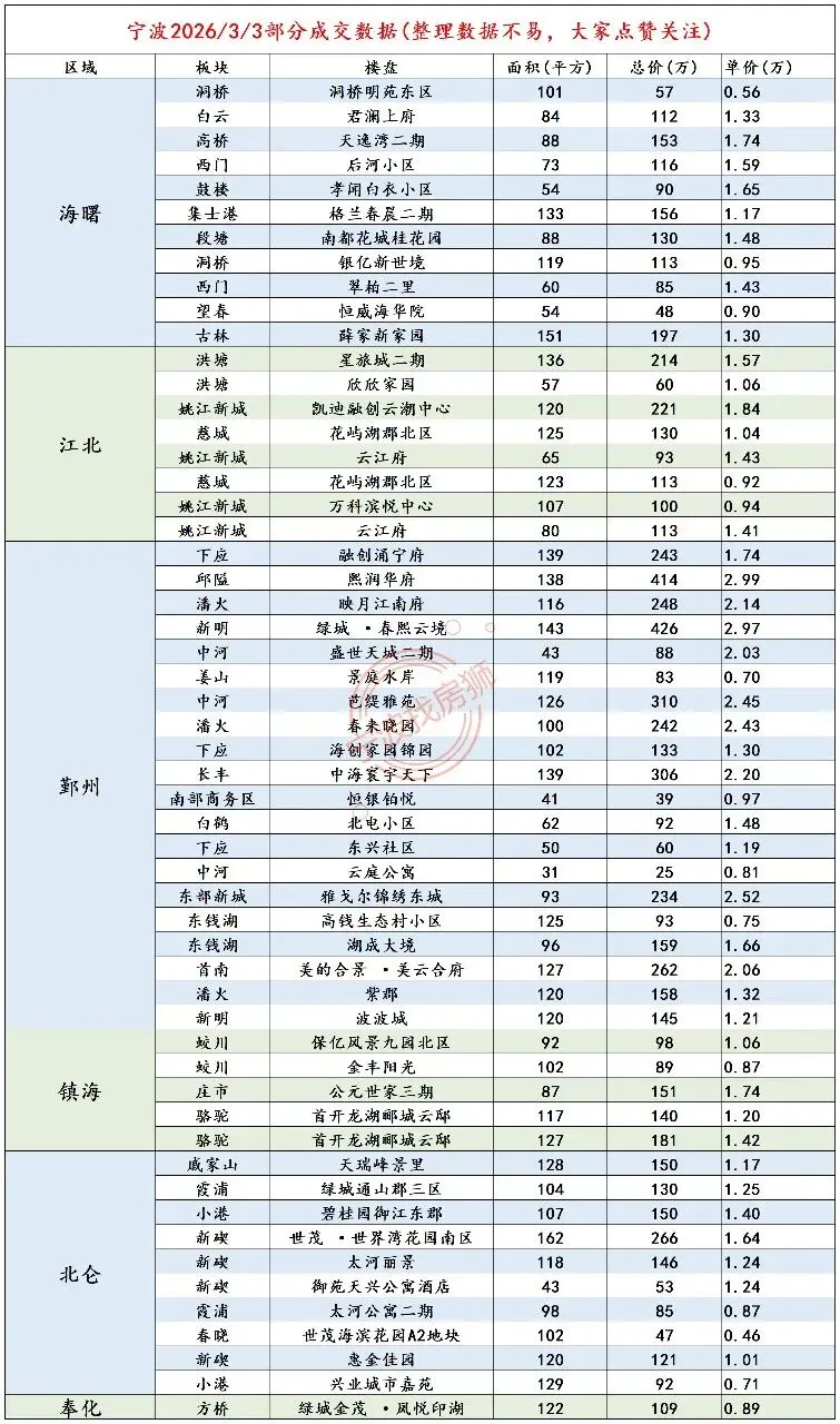 3月3日宁波二手房成交价格