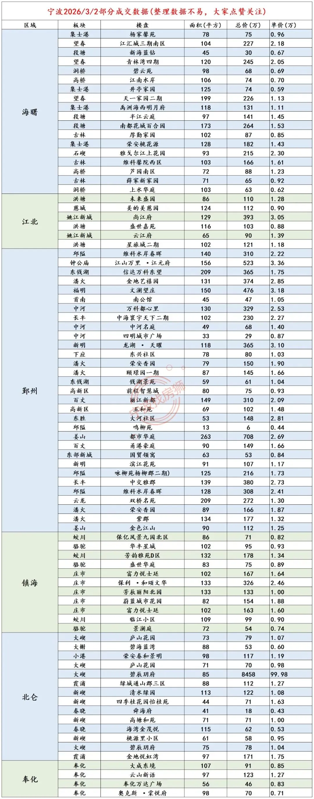 >3月2日宁波二手房成交价格