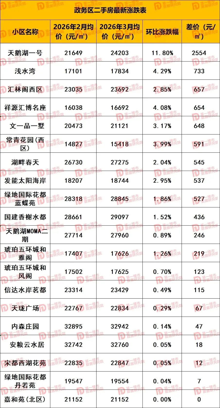 涨幅最高的小区是天鹅湖一号,涨了2554元/㎡。