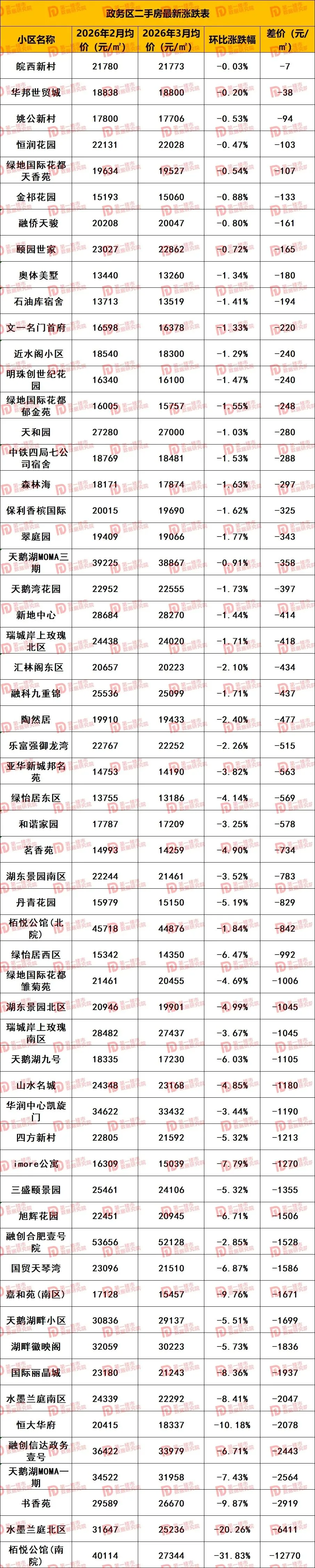 今天,本站统计了政务区78家二手房小区,3月份的最新房价,并环比对比2月份,看下是涨是跌。注:数据来源于安居客,因成交房源没有均价数据,统计的皆为挂牌均价,请注意甄别,数据仅供参考。