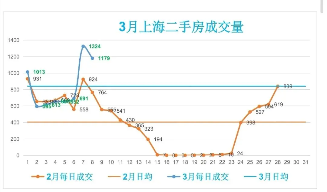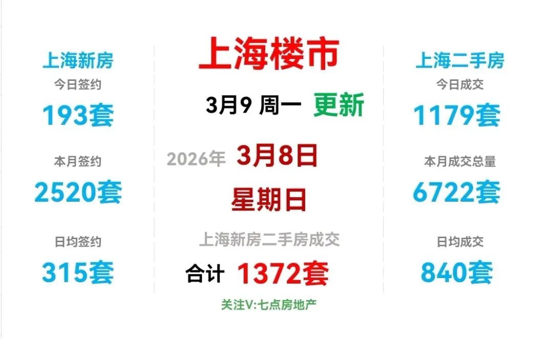 昨日(3月8日,周日),上海新房和上海二手房成交量合计1372套。