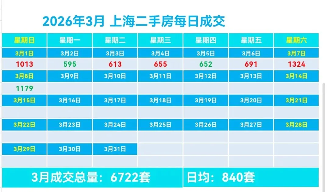 🏡3月,上海二手房成交量累计6722套,日均成交840套,较上个月日均减少436套(降幅107.92%)。