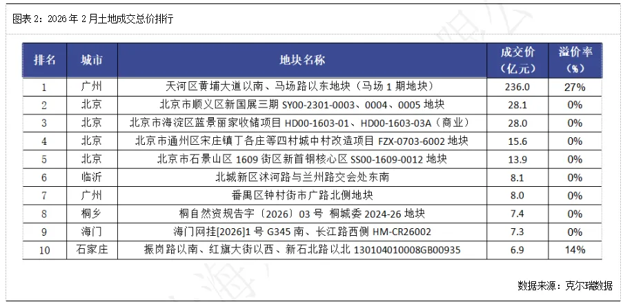 2026年1-2月,TOP100企业拿地总额950.4亿元,同比下降52.4%,降幅较上月基本持平。受春节假期影响,2月土地供应缩量,土地成交规模仍处在季节性低位。从土地溢价率来看,2月全国300城住宅用地平均溢价率为11%。