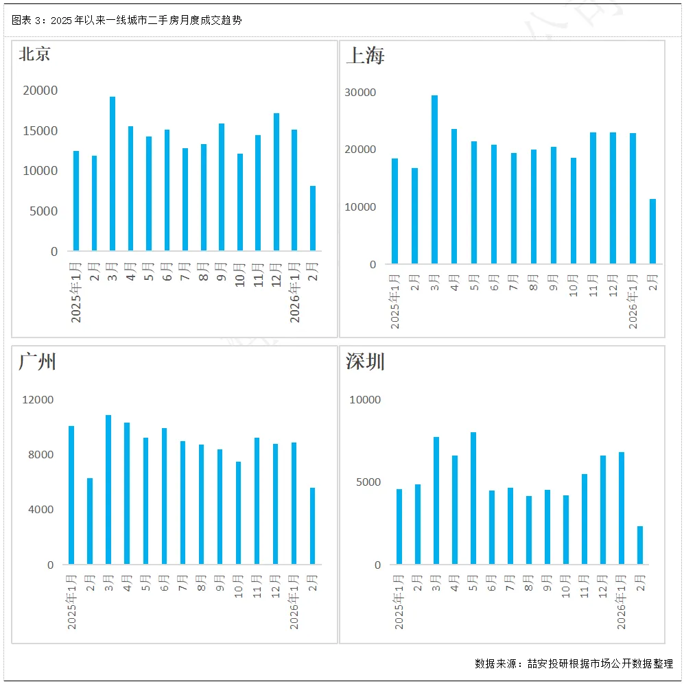2026年1-2月,一线城市二手房累计成交80981套,2025年同期累计成交量85215套,同比下降5.0%。尽管受到春节假期的影响,成交量环比明显下滑,但较去年同期相比市场整体热度未见衰减,显示出一线城市二手房整体需求的回暖,呈现“淡季不淡”局面。分城市看,1-2月北京二手房成交23212套,同比下滑4.7%;上海二手房成交34149套,同比下滑2.8%;广州二手房成交14479套,同比下滑11.26%;深圳二手房成交9141套,同比下滑2.88%。