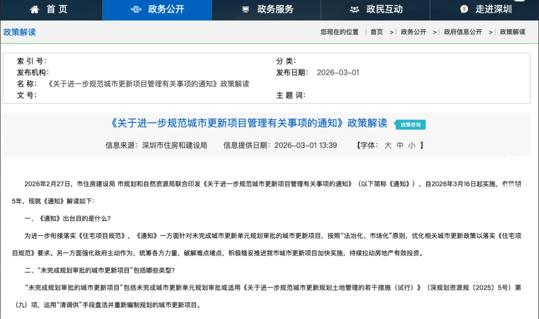 深圳市住房和建设局、深圳市规划和自然资源局近日印发《关于进一步规范城市更新项目管理有关事项的通知》,通知自2026年3月16日起施行,有效期5年。通知提出,优化保障性住房配建要求。已完成城市更新单元规划审批的城市更新项目按原规定执行保障性住房配建要求。未完成规划审批的城市更新项目,取消保障性住房奖励容积,原则上可不配建保障性住房。市相关主管部门、各区政府、前海管理局应通过新增建设、存量房屋盘活、多元收购等各种渠道统筹落实保障性住房建设筹集要求。《深圳市拆除重建类城市更新单元保障性住房配建规定》(深建规[2025]11号)中旧工业区改保障性住房项目不适用此条款。