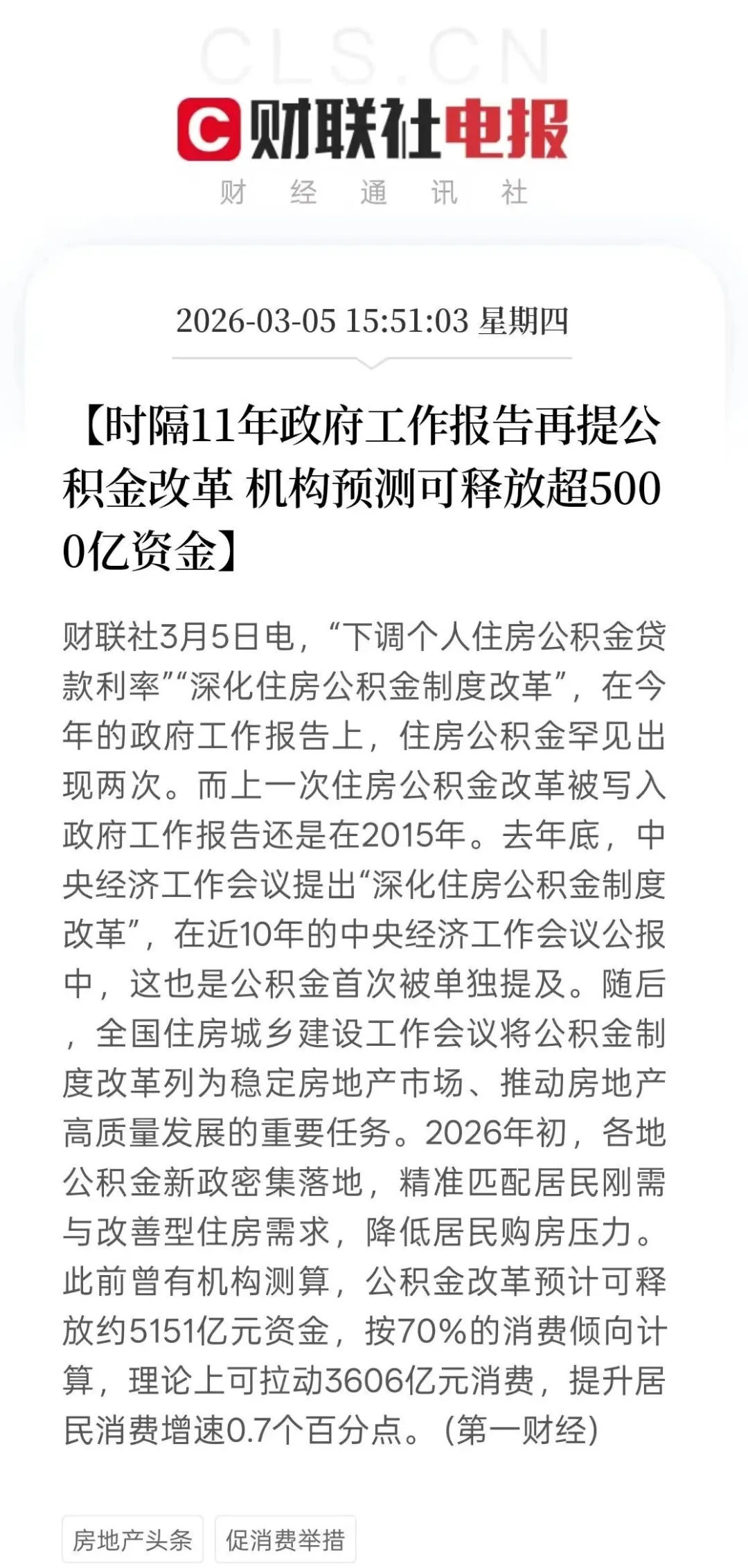 3月5日,“下调个人住房公积金贷款利率”“深化住房公积金制度改革”,在今年的政府工作报告上,住房公积金罕见出现两次。而上一次住房公积金改革被写入政府工作报告还是在2015年。去年底,中央经济工作会议提出“深化住房公积金制度改革”,在近10年的中央经济工作会议公报中,这也是公积金首次被单独提及。随后,全国住房城乡建设工作会议将公积金制度改革列为稳定房地产市场、推动房地产高质量发展的重要任务。2026年初,各地公积金新政密集落地,精准匹配居民刚需与改善型住房需求,降低居民购房压力。此前曾有机构测算,公积金改革预计可释放约5151亿元资金,按70%的消费倾向计算,理论上可拉动3606亿元消费,提升居民消费增速0.7个百分点。