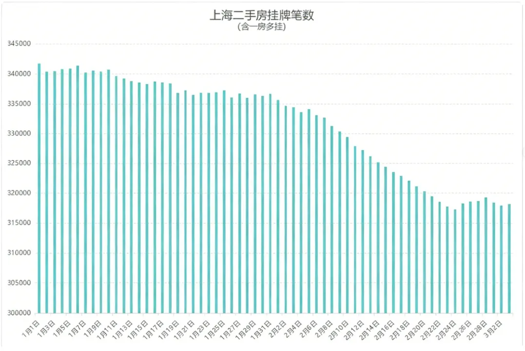 一个最具说服力的指标是:截至3月2日,上海二手房总挂牌笔数约为317956笔,较2月2日减少了16724笔。这意味着短短一个月内,市场上的可售房源减少了超过1.6万套。
