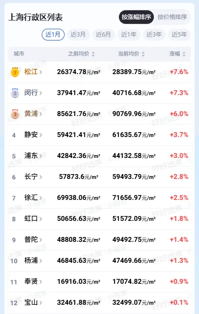 更值得注意的是,多区迎来普涨:松江单月涨幅7.6%,闵行涨7.3%,黄浦涨6%,静安、浦东、长宁、徐汇等均现上涨!