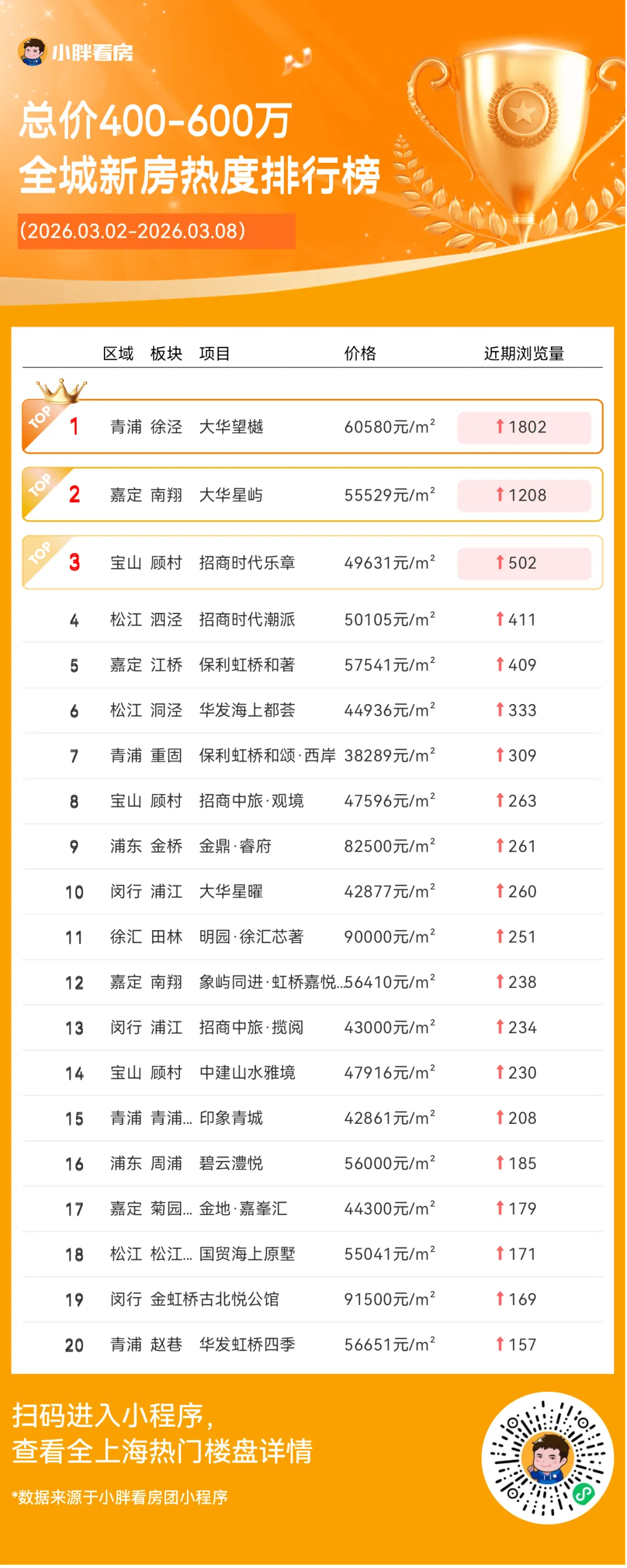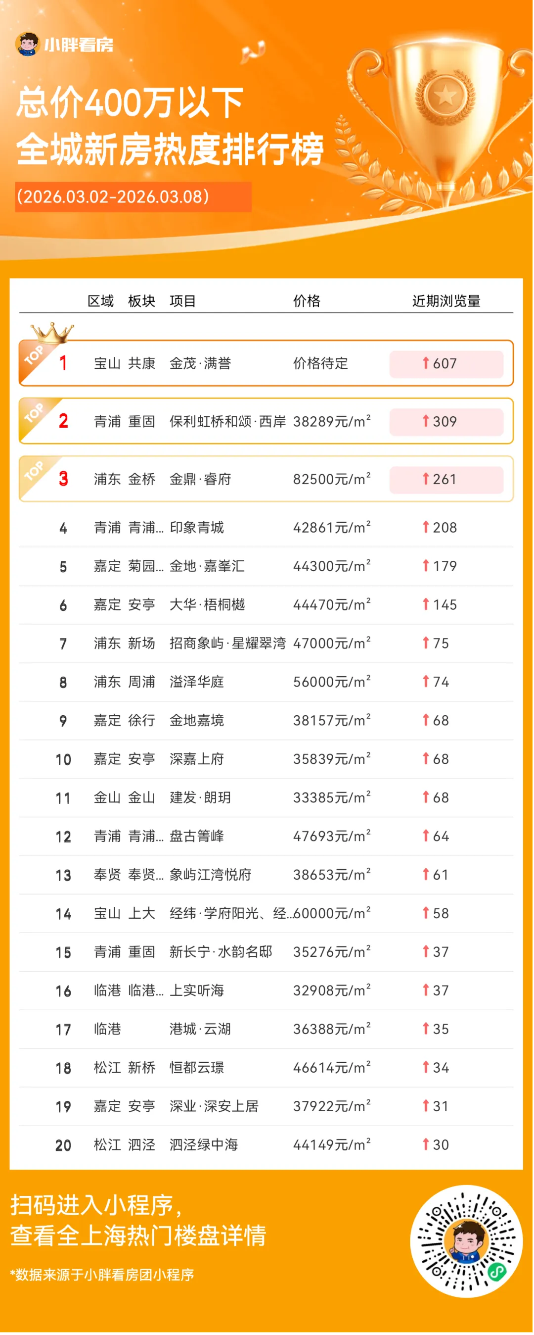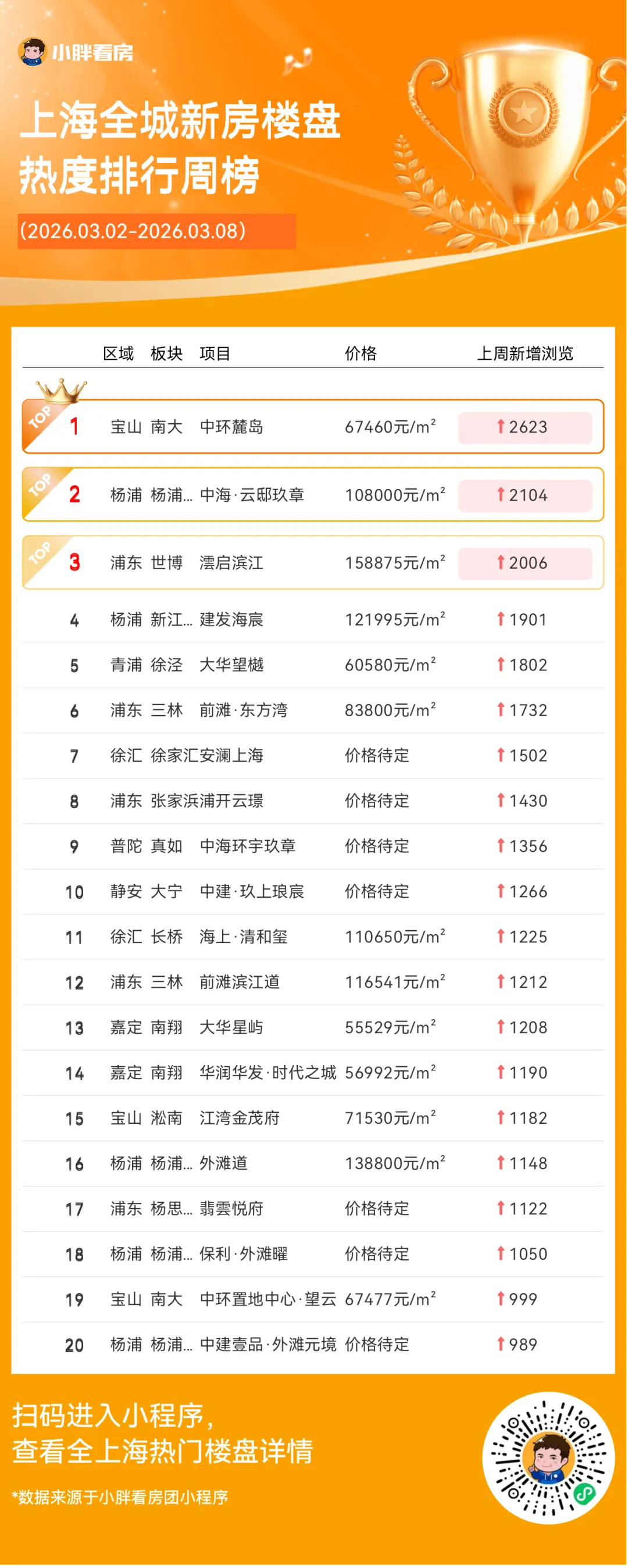 小胖看房团小程序发布一周新房热度榜单(根据新增浏览量排名),分全城榜和总价榜。看看本周谁的人气最高?你心仪的楼盘是否上榜吧~上海二手房最新成交量:昨日(3月8日)网签1179套(含住宅、商业、车位等)。
