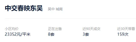 根据贝壳信息显示,中交春映东吴目前8套挂牌出售,挂牌均价23352元/平。
