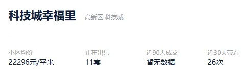 根据贝壳信息显示,科技城幸福里目前11套挂牌出售,挂牌均价22296元/平。