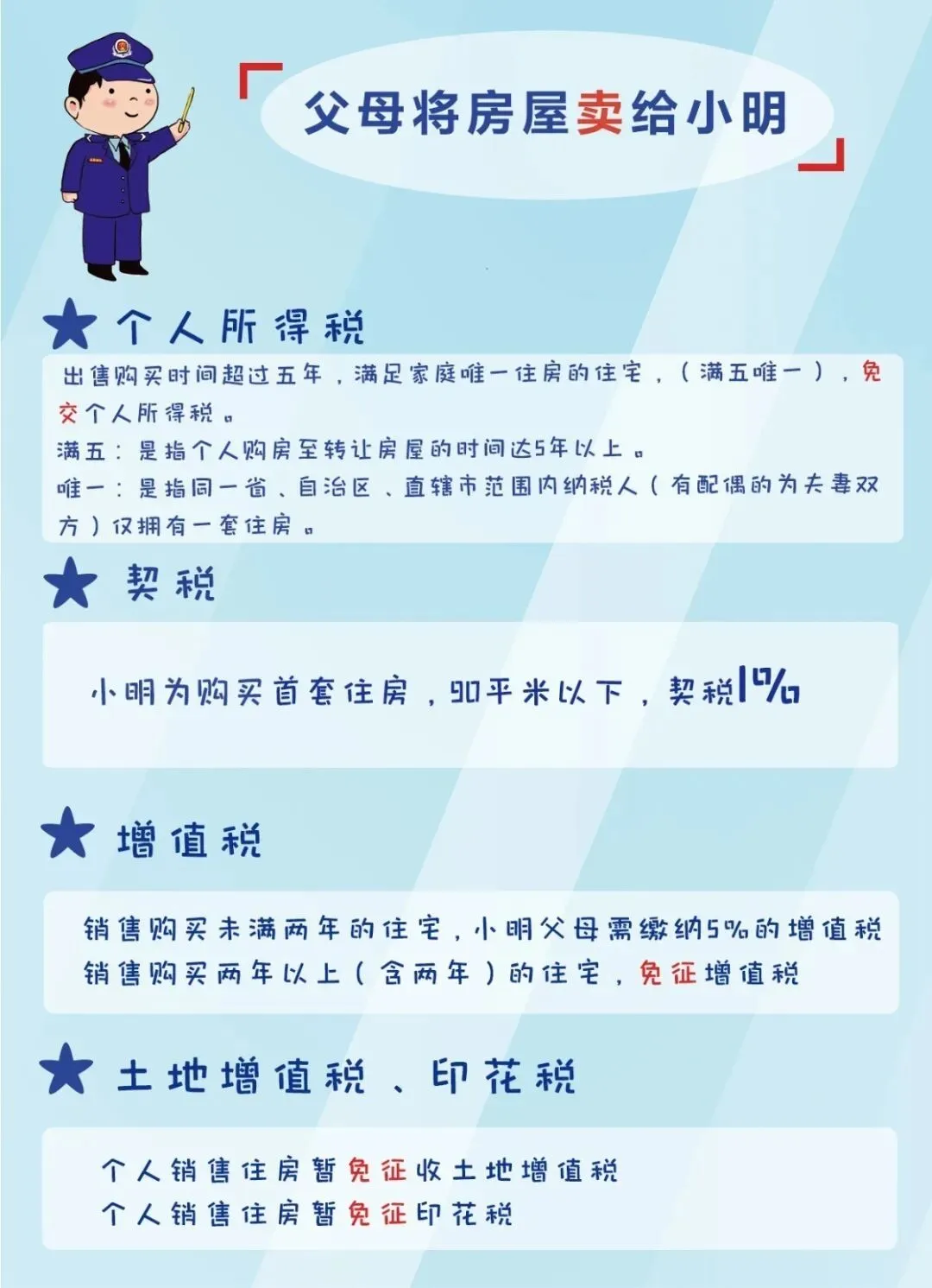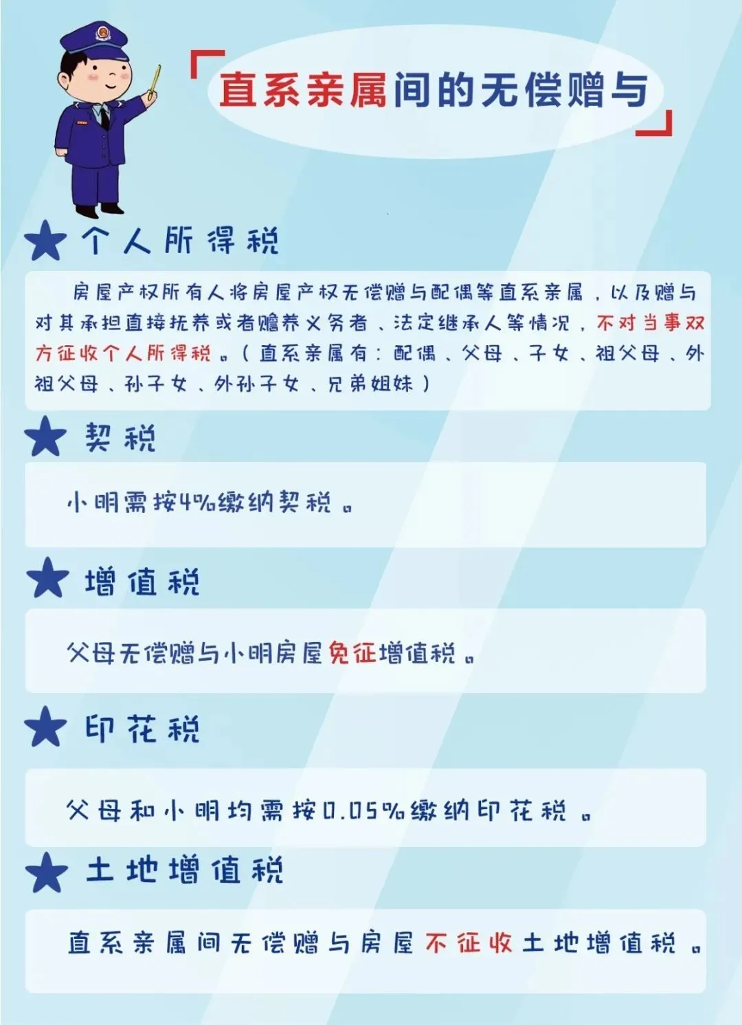 个人所得税:按照《财政部国家税务总局关于个人无偿受赠房屋有关个人所得税问题的通知》(财税〔2009〕78号)第一条规定,符合以下情形的,对当事双方不征收个人所得税: