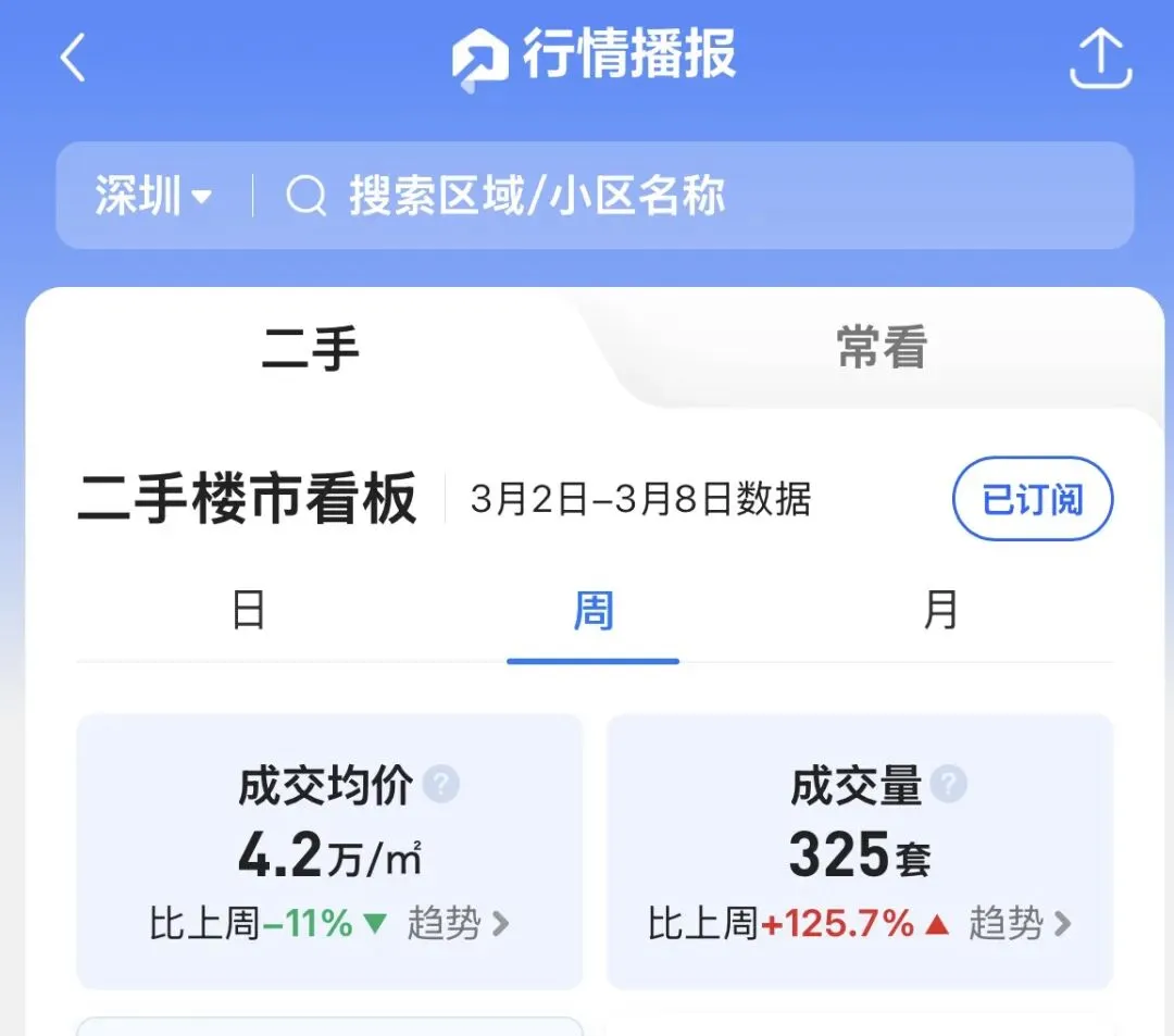 根据贝壳成交数据看板,深圳2026年3月份第一周(2-8号)的二手房成交均价约为4.2万/平米,